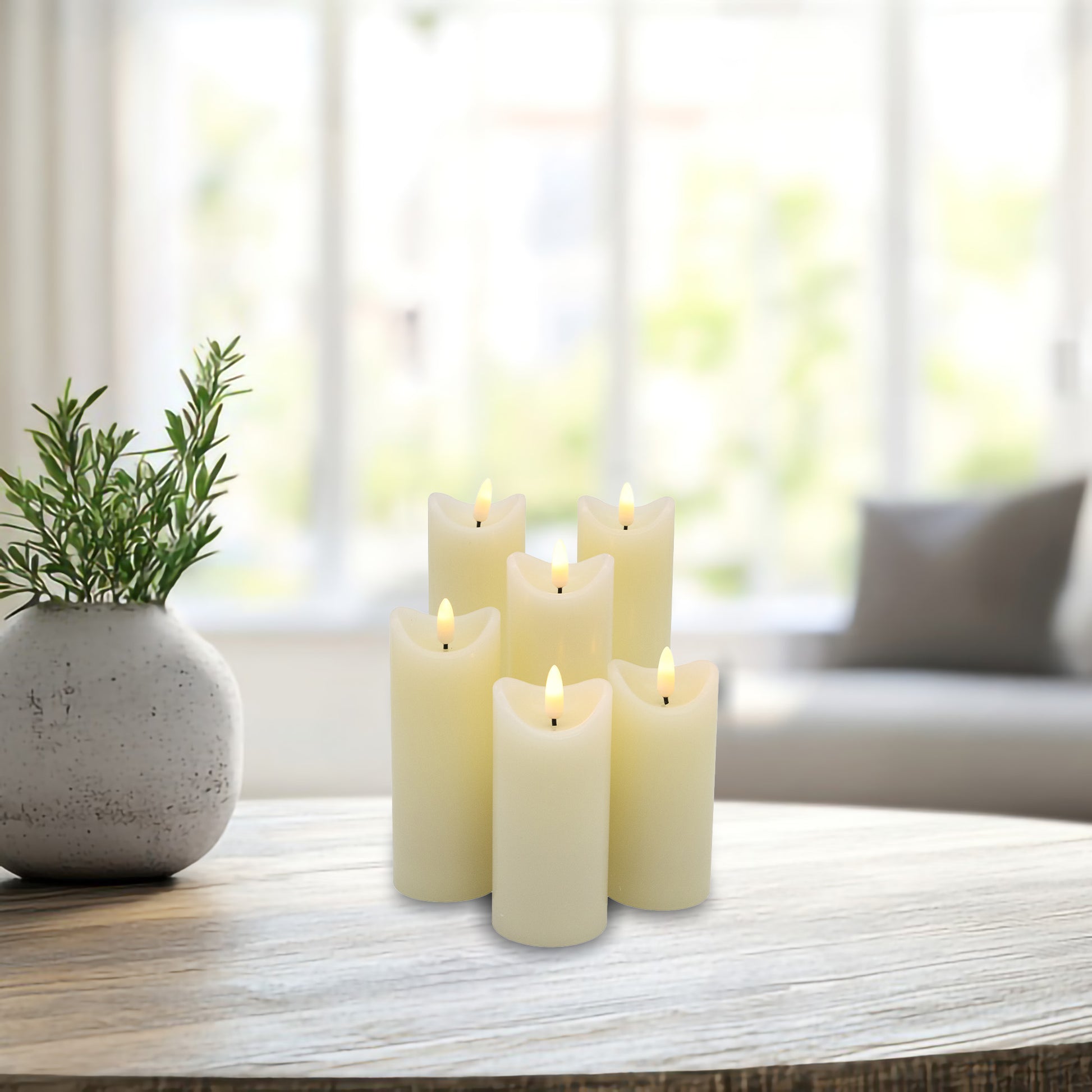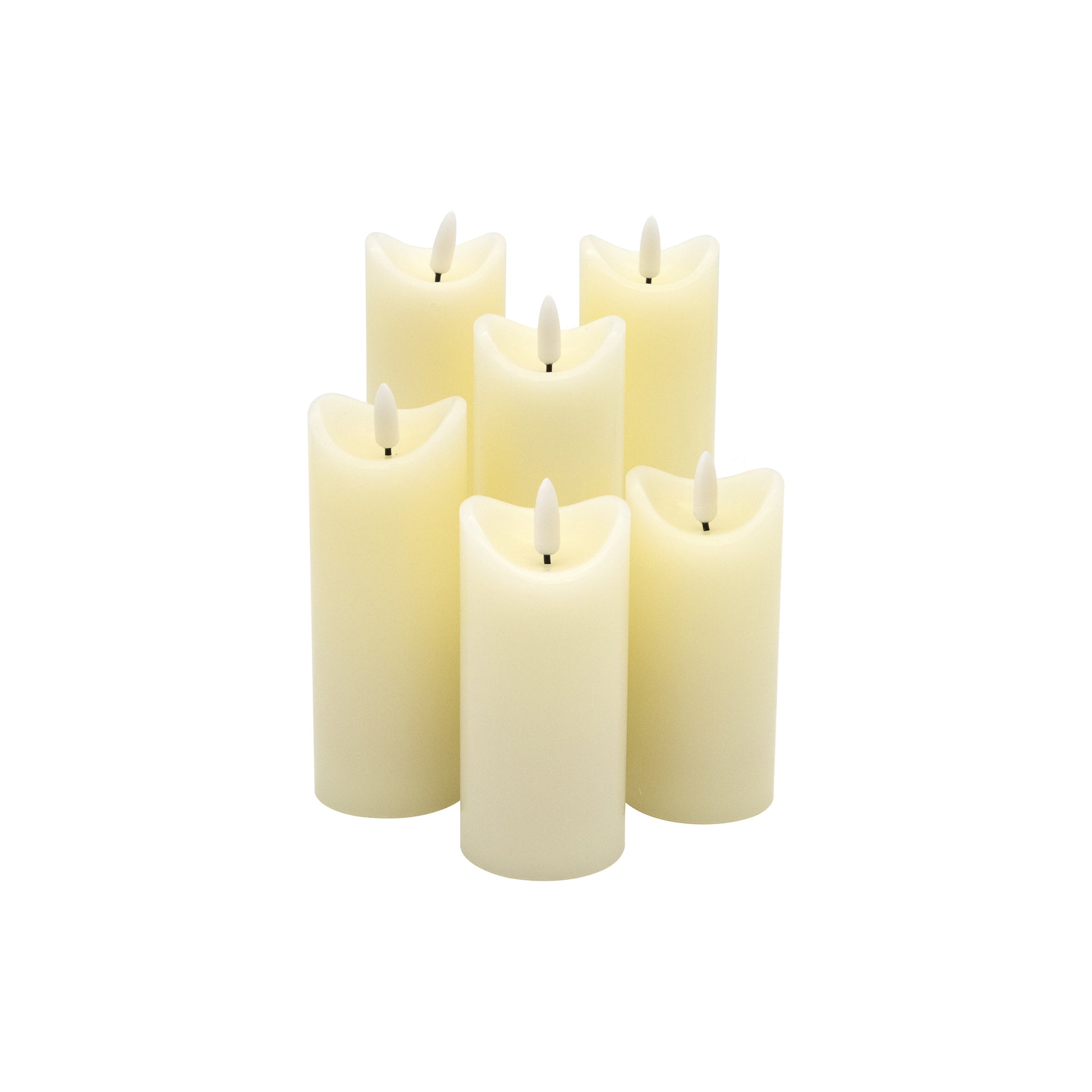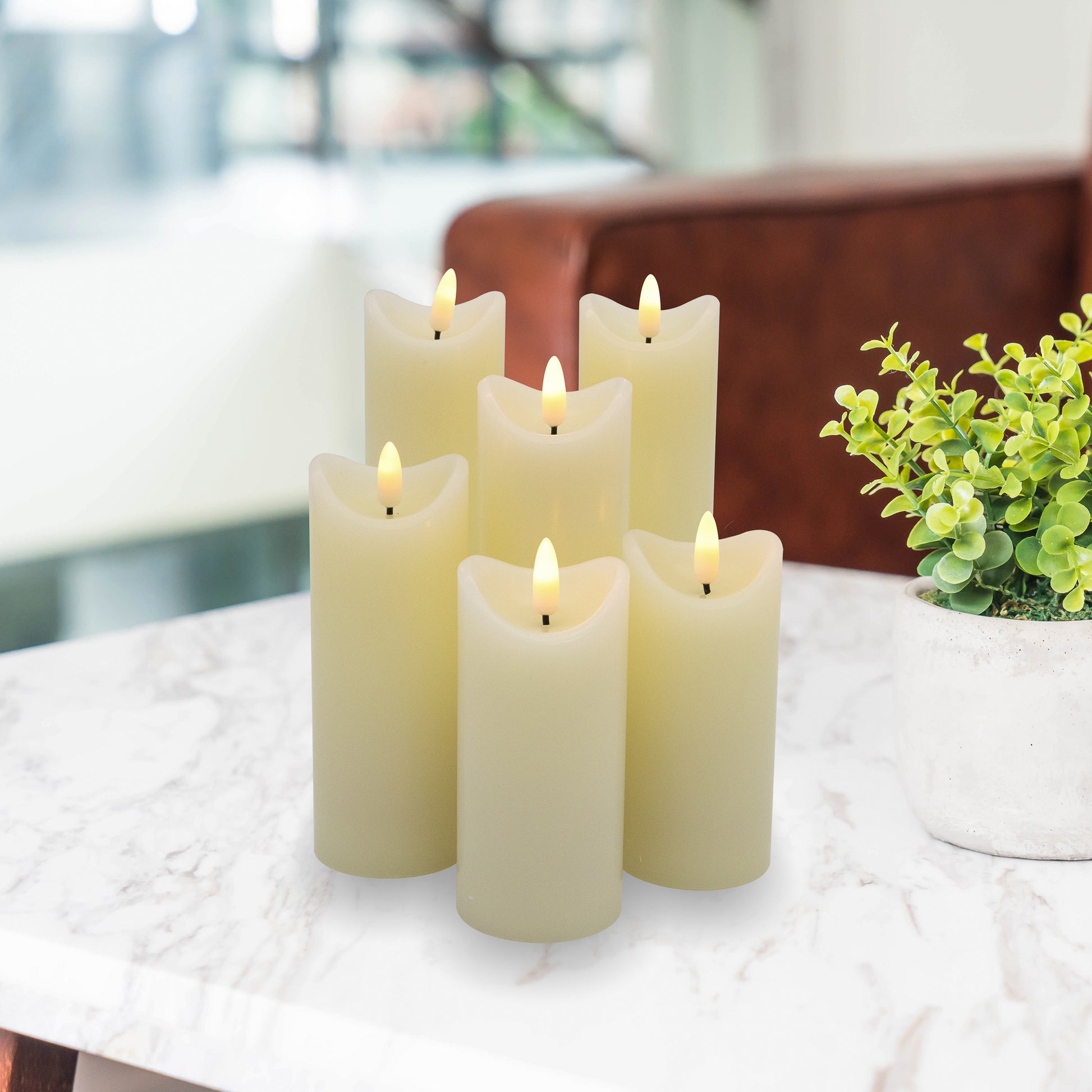 This set of six 3D wick LED pillar candles, constructed of real wax and paired with the warm glow of a flickering light, creates beautiful ambiance in your home. These elegant battery operated cream candles are unscented and feature a convenient built-in timer for 6 hours on and 18 hours off. They provide the beautiful look of real candles without the risk of a burning flame. The wax construction paired with the flickering flame looks so authentic and casts natural light, you'll think it's a real candle. Each candle requires 2 AA batteries (not included).
