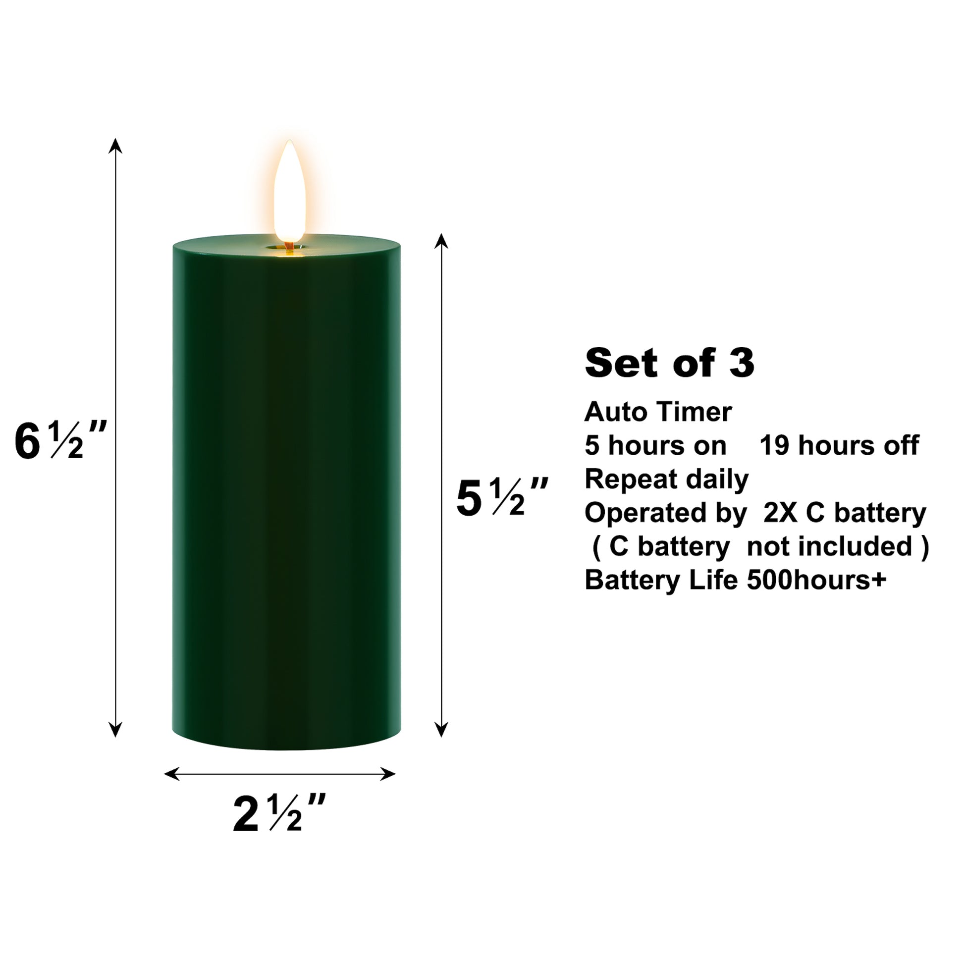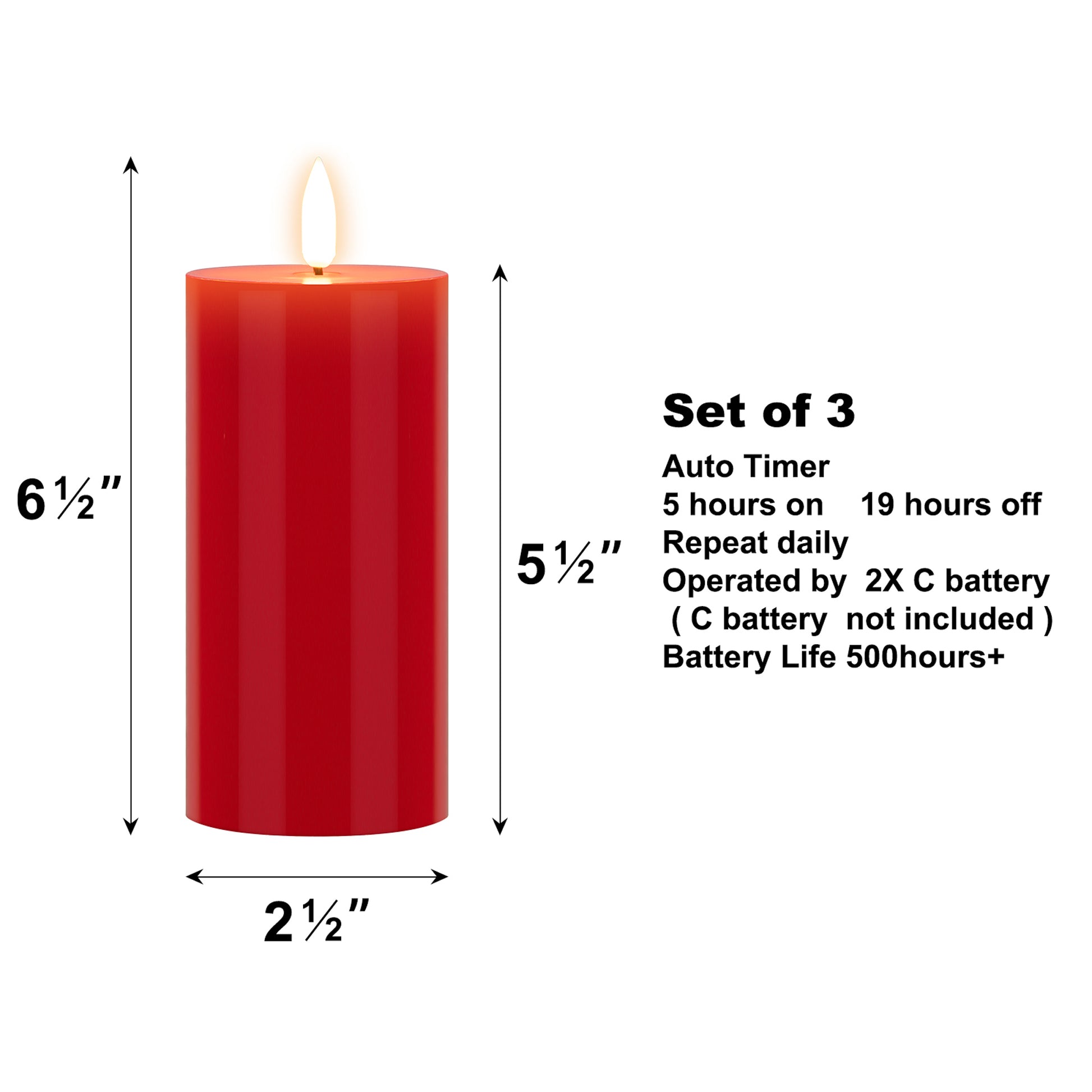 This set of three 3D-wick LED pillar candles creates a beautiful ambiance in your home. These elegant battery-operated candles are constructed of plastic to keep the candle surface clean and smooth without the chance of dents like real wax. The lifelike LED light gives the effect of a real candle without the worry of drips, smoke, or flames. The pivoted flame-shaped wick looks so authentic and casts natural light, you’ll think it’s a real burning candle. Each candle requires 2 C batteries (not included).