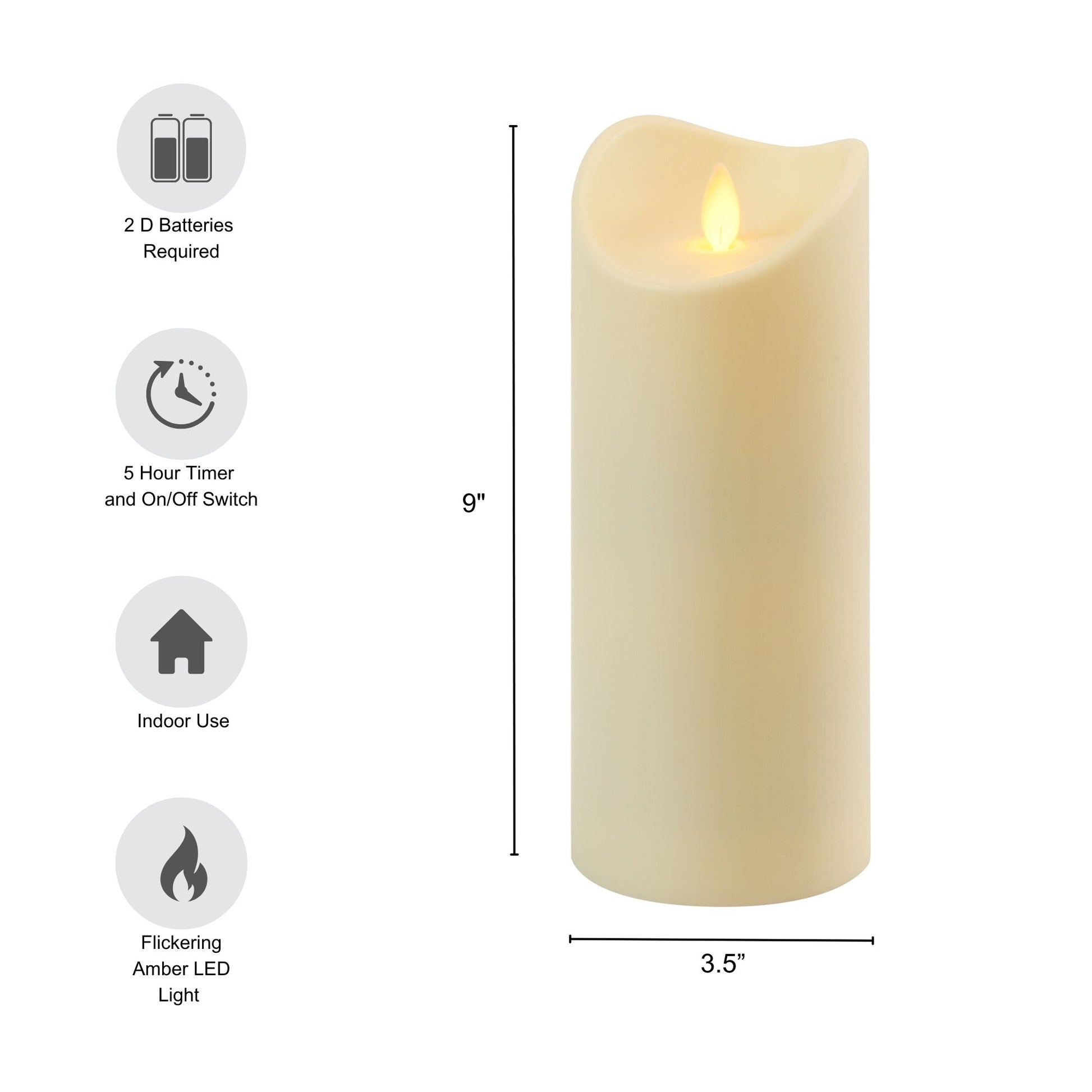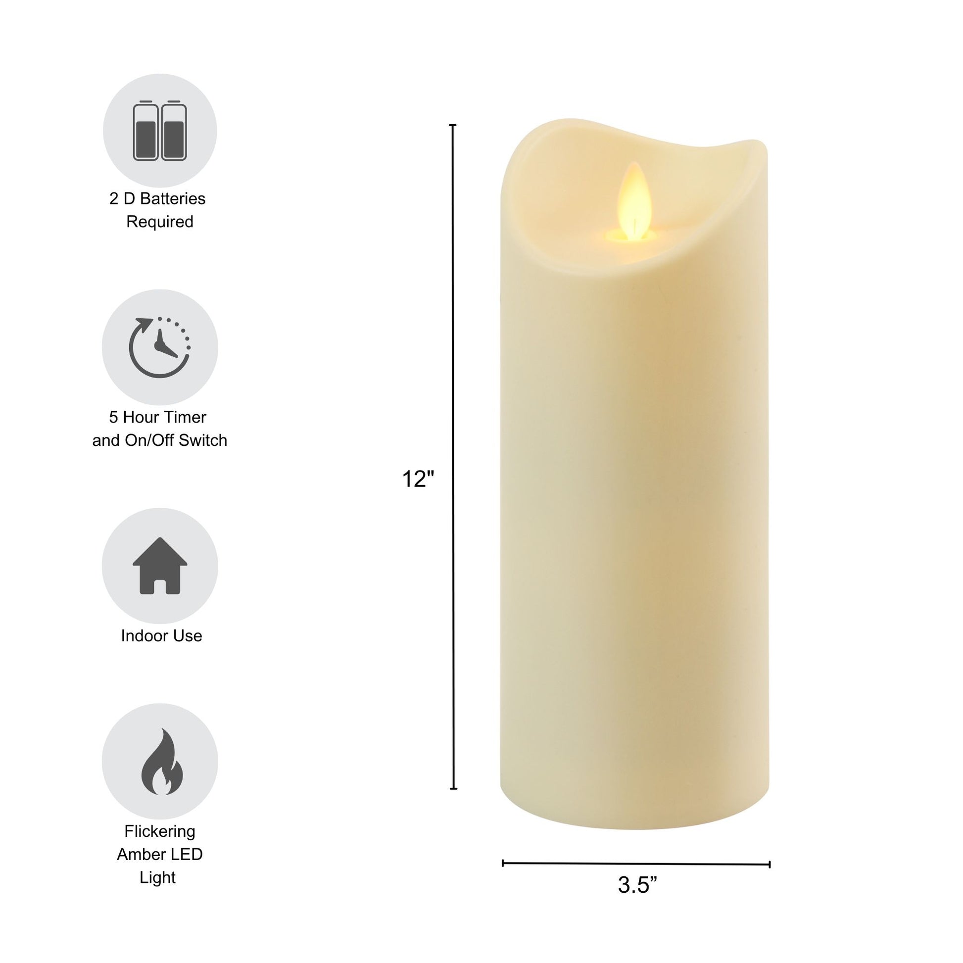Add a touch of elegance to your home décor with this premium battery-operated pillar candle with a natural flickering flame. This 5" flickering flame pillar candle features a red exterior and a convenient 5-hour timer paired with a battery-operated LED light. The battery-operated LED pillar candle casts an ambient warm amber glow with the natural touch of its flickering flame, making it the perfect accent lighting for a special occasion, event, or your everyday home décor. The plastic construction makes the battery-operated flickering flame pillar candle resistant to dings and dents, making it a practical addition to your décor. Candle requires 2 D batteries (not included).