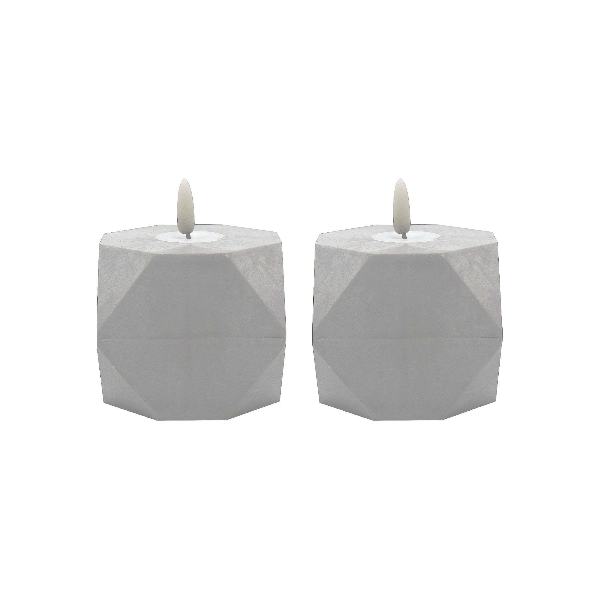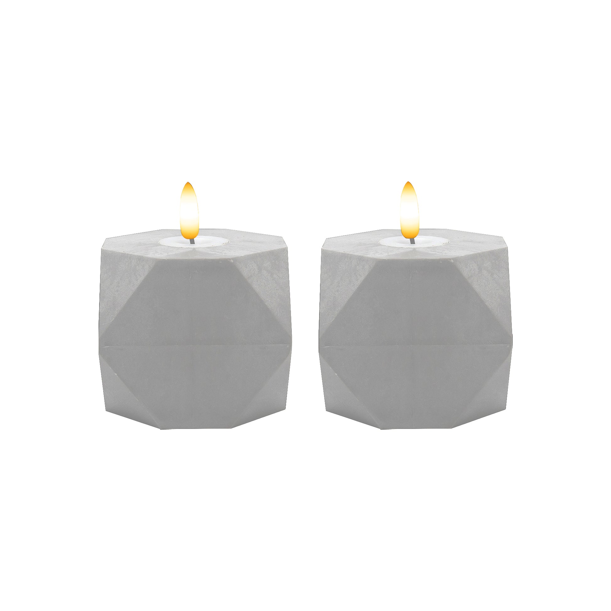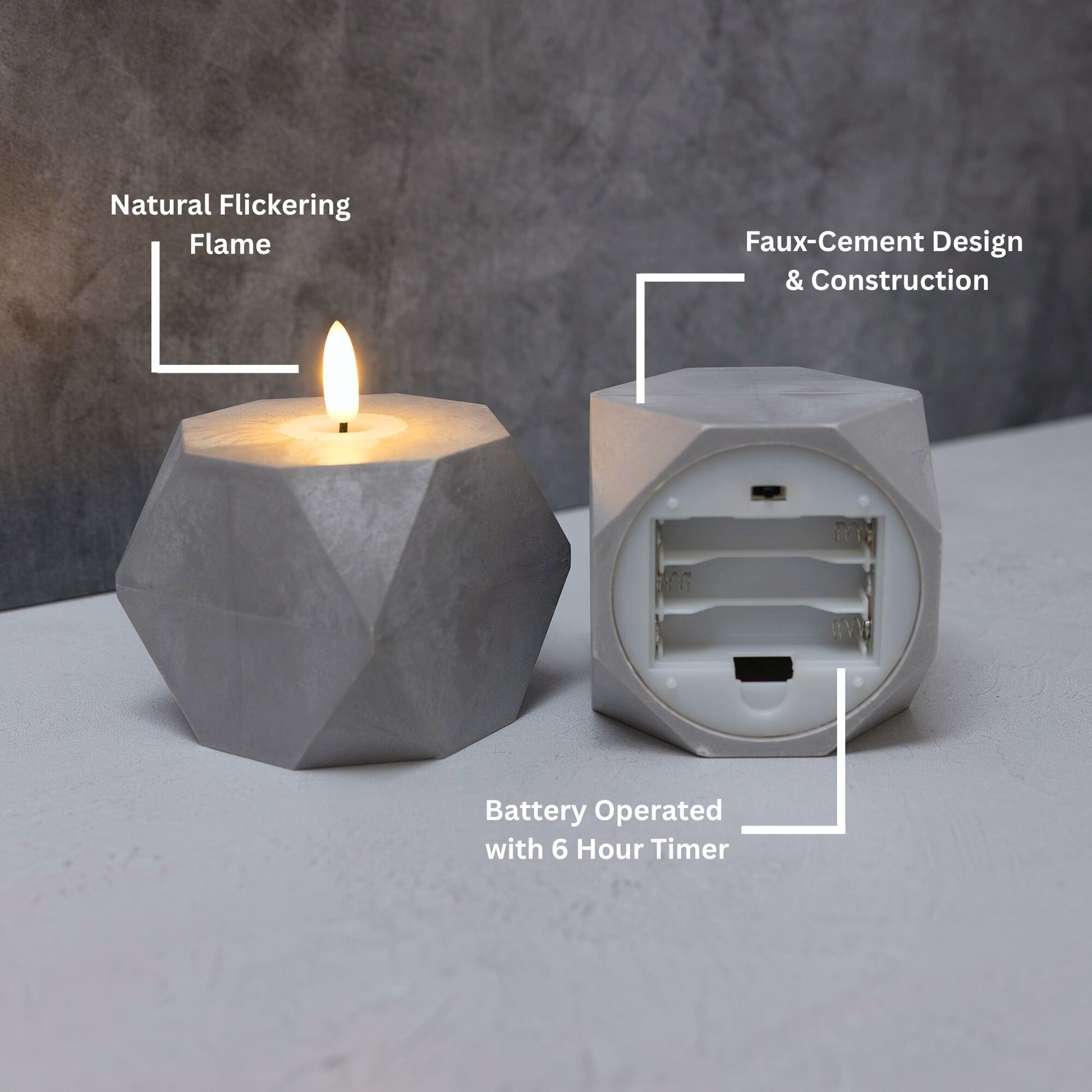 Accent your home with this modern pair of geometric flameless candles with 3D wick flame. The warm white LED light adds ambient lighting to a table setting, mantel, or centerpiece. Get the classic soft glow of real candles without the worry of any drips, smoke, or flames. These faux-cement candles have a convenient timer incorporated for 6 hours on and 18 hours off. Each candle requires 3 AAA batteries (not included).