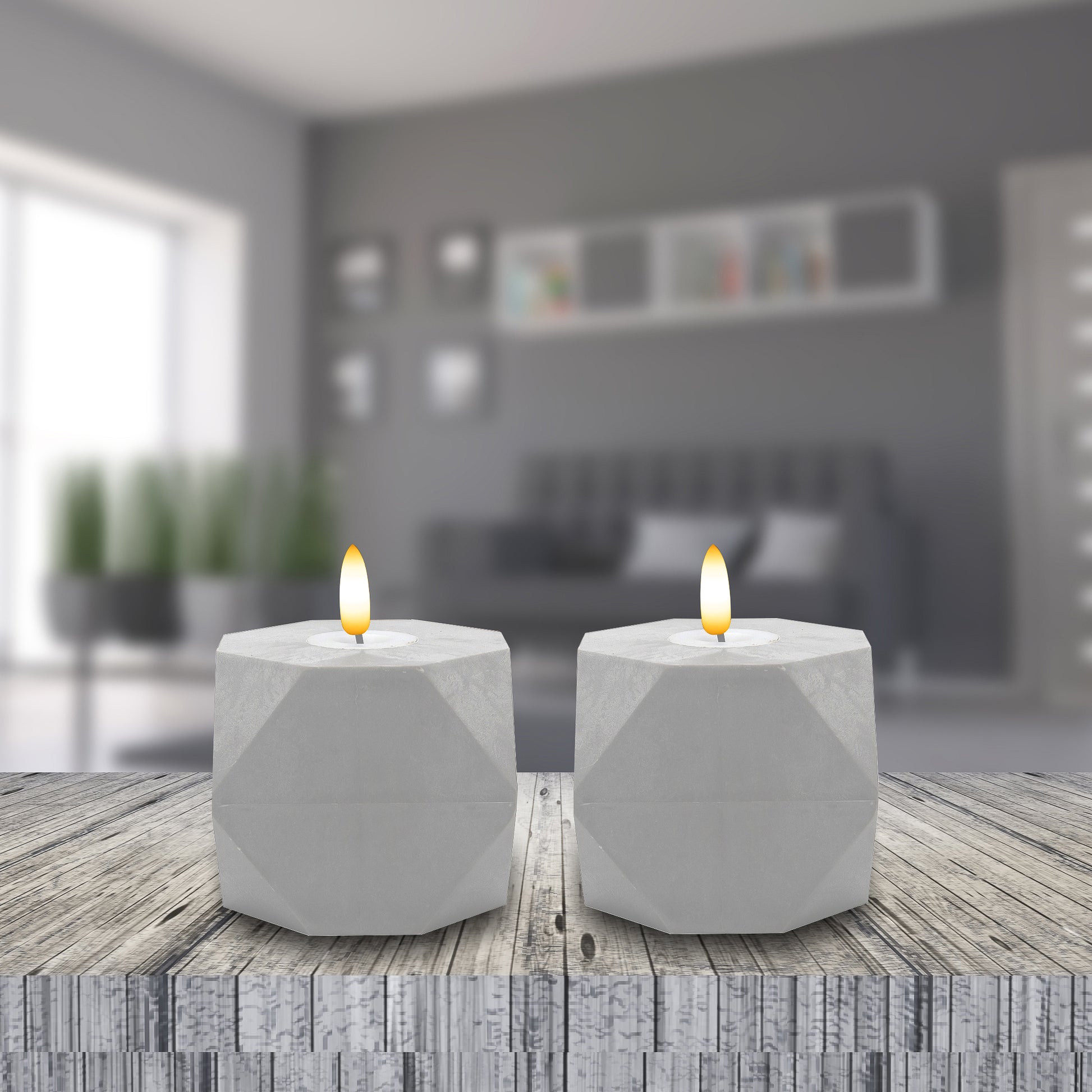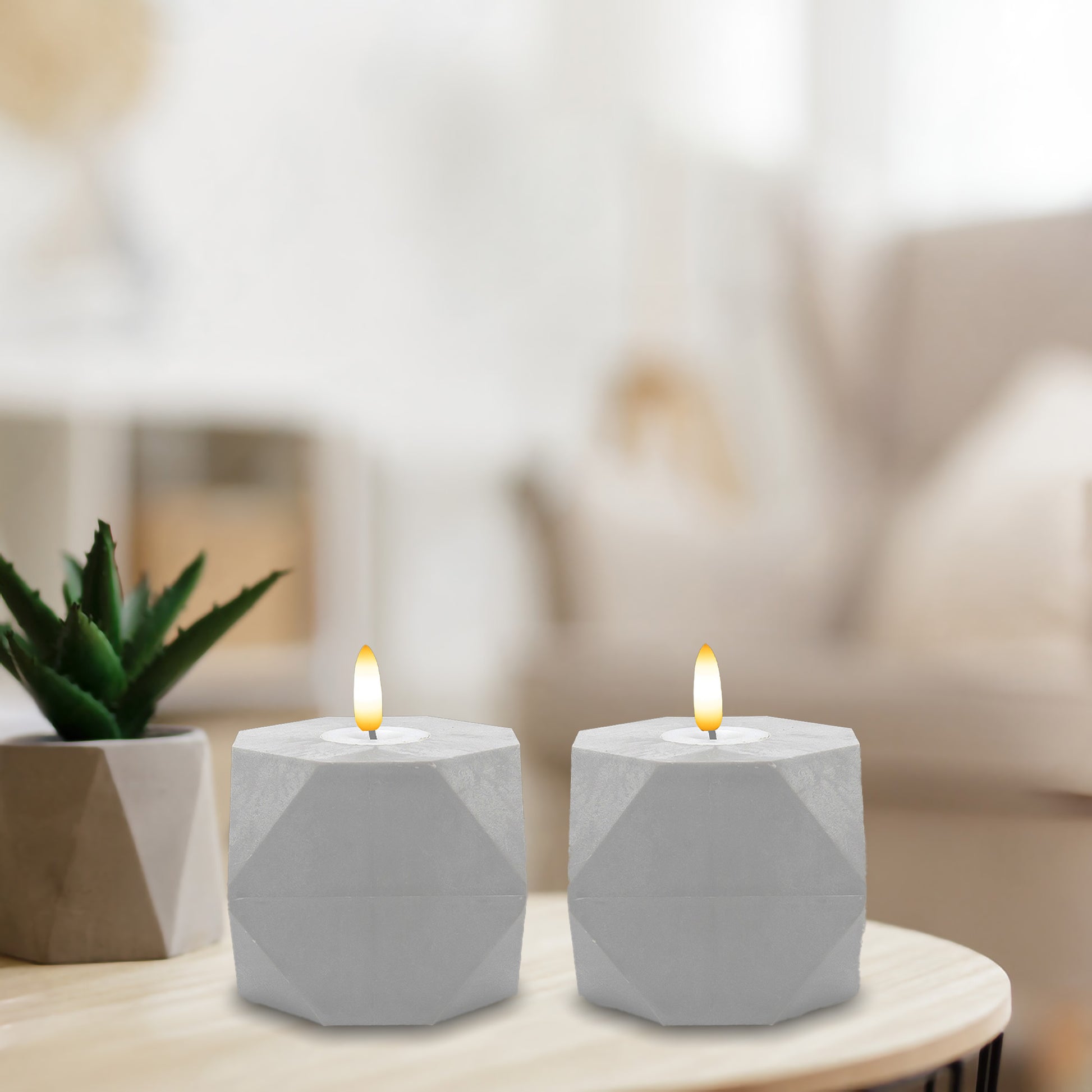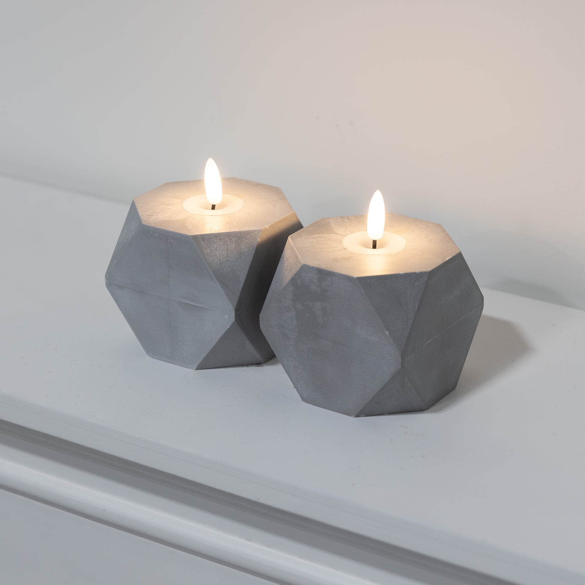 Accent your home with this modern pair of geometric flameless candles with 3D wick flame. The warm white LED light adds ambient lighting to a table setting, mantel, or centerpiece. Get the classic soft glow of real candles without the worry of any drips, smoke, or flames. These faux-cement candles have a convenient timer incorporated for 6 hours on and 18 hours off. Each candle requires 3 AAA batteries (not included).