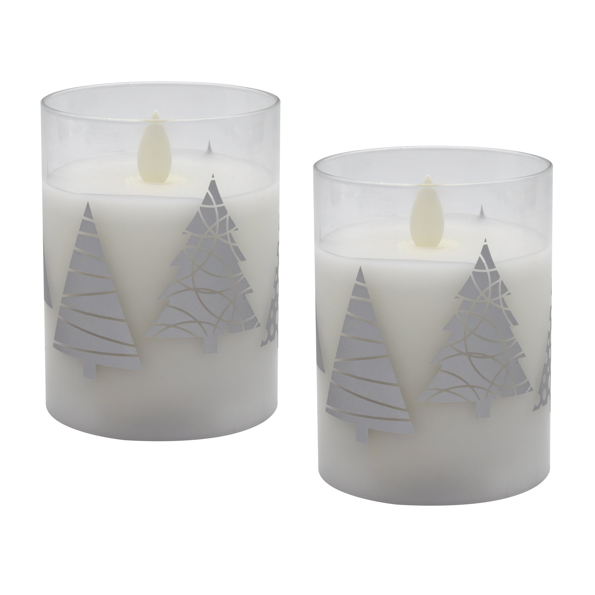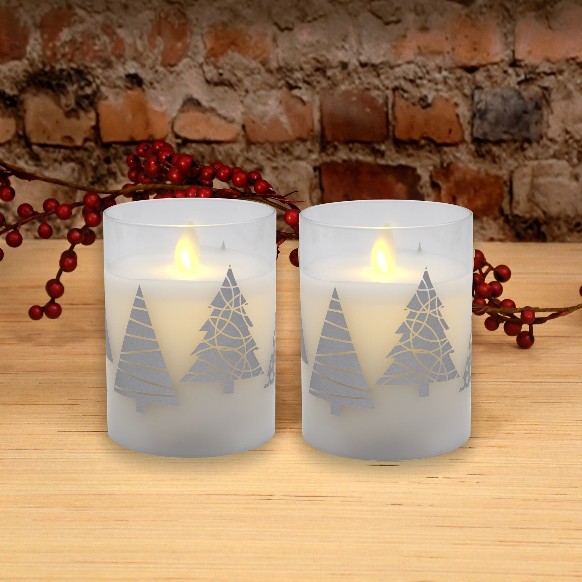 These lovely battery operated LED candles with silver Christmas trees printed on glass and moving flame are perfect for your holiday décor. The clear glass includes genuine poured wax and an enclosed glowing LED light. The lights have a convenient timer for 6 hours on and 18 hours off. The natural glow adds ambient lighting to your décor. Each candle requires 3 AAA batteries (not included).