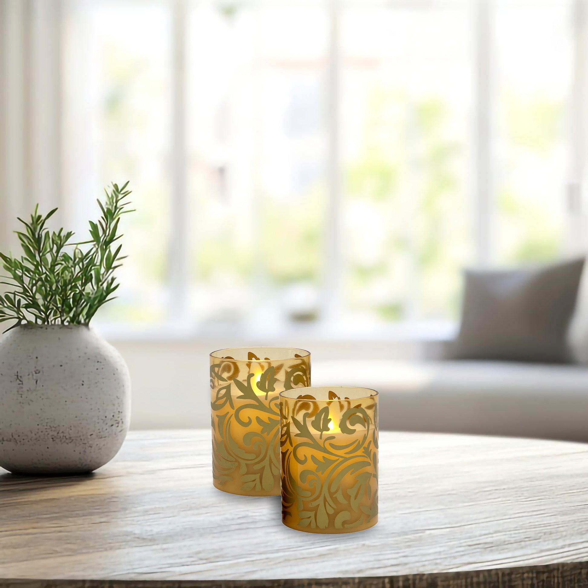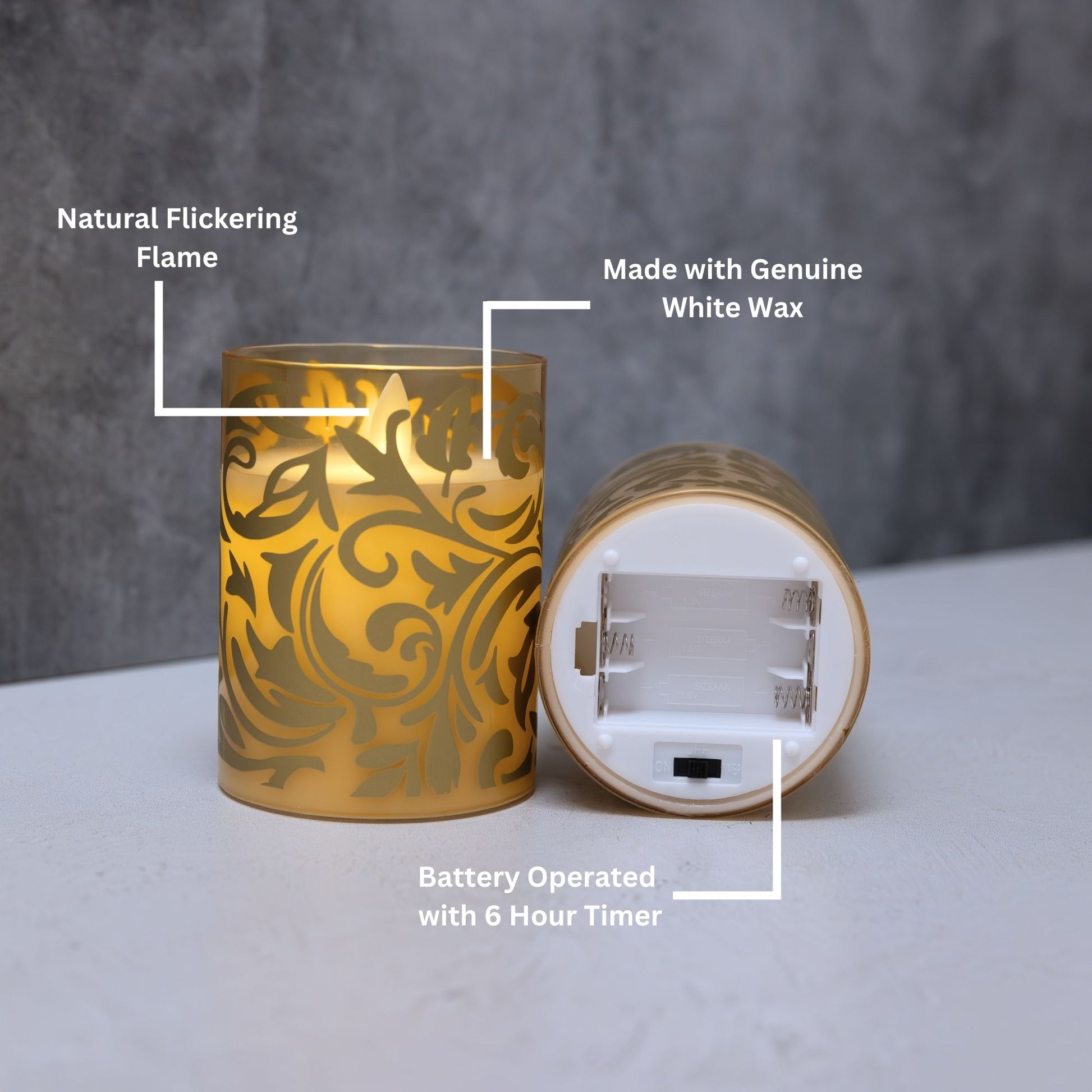 Battery Operated Glass LED Candles, Gold Jacquard - Set of 2