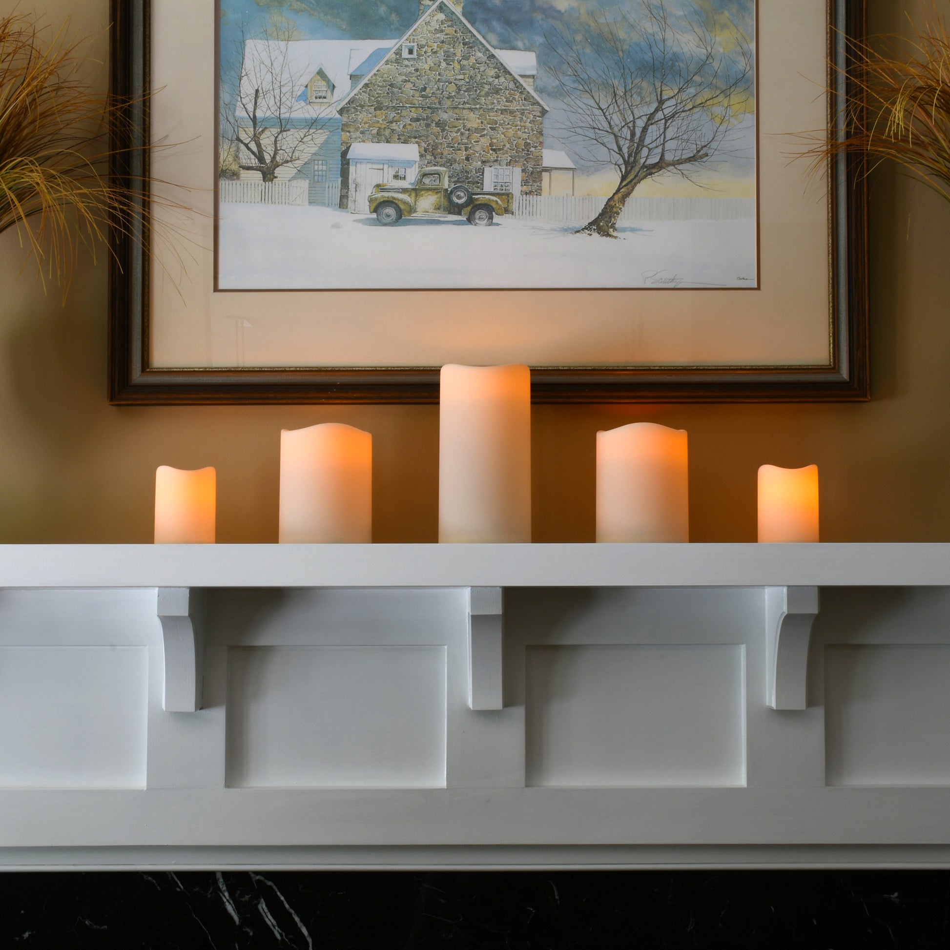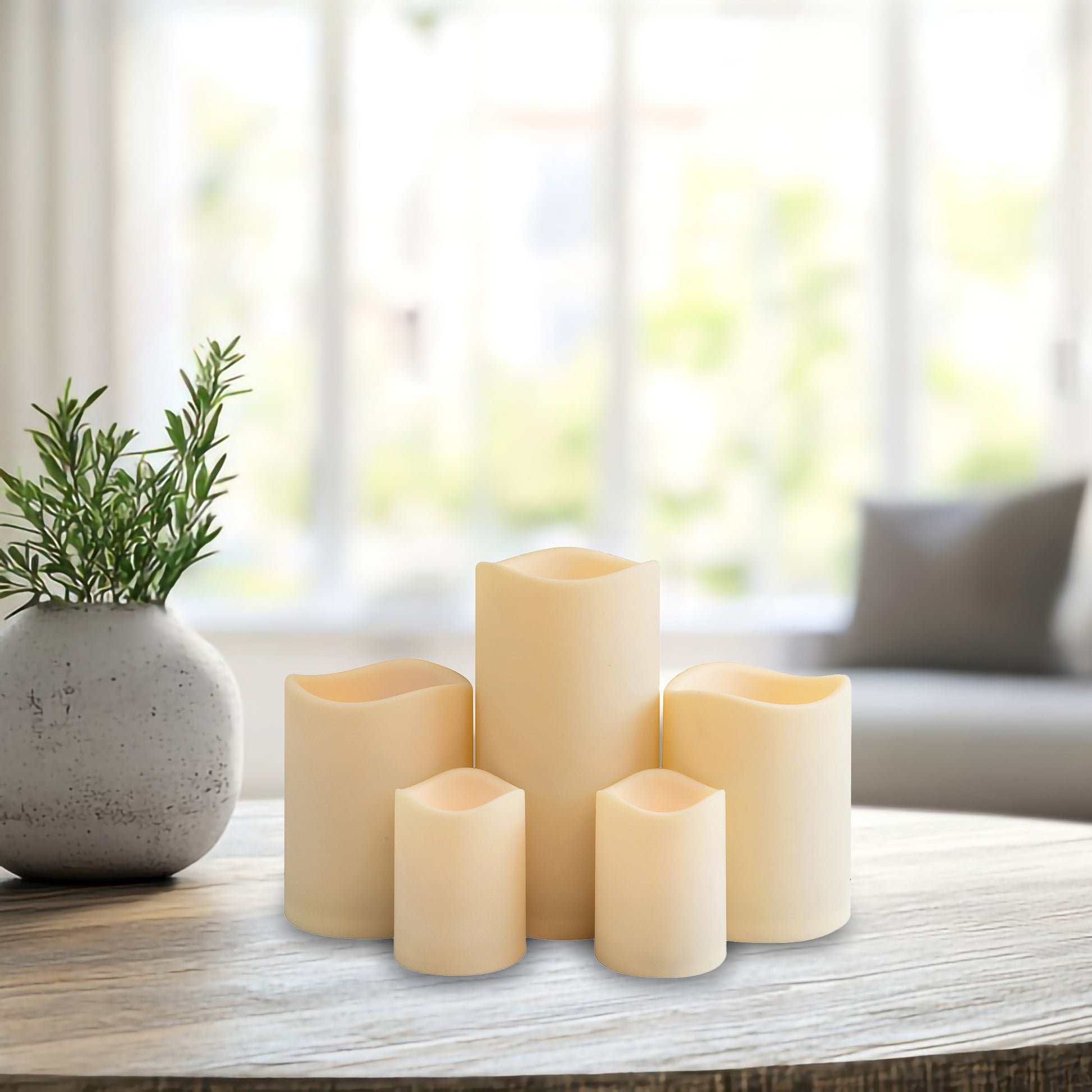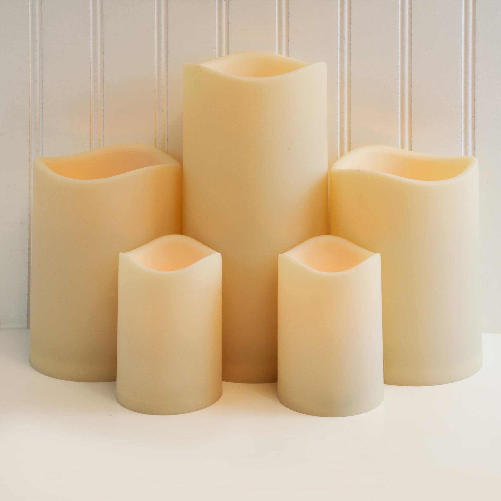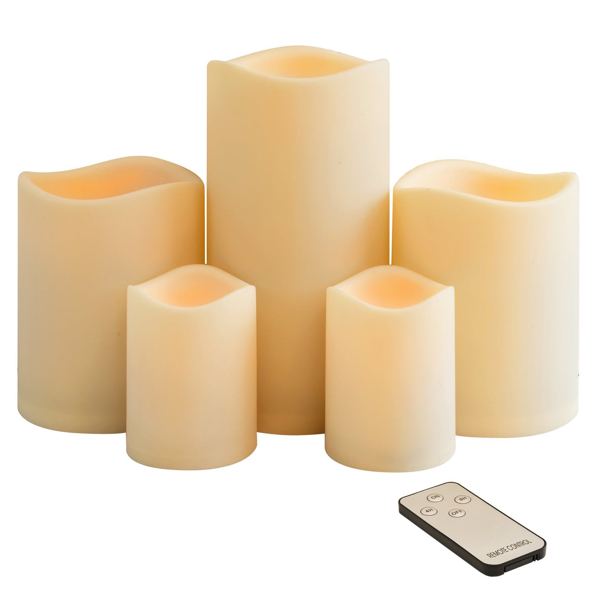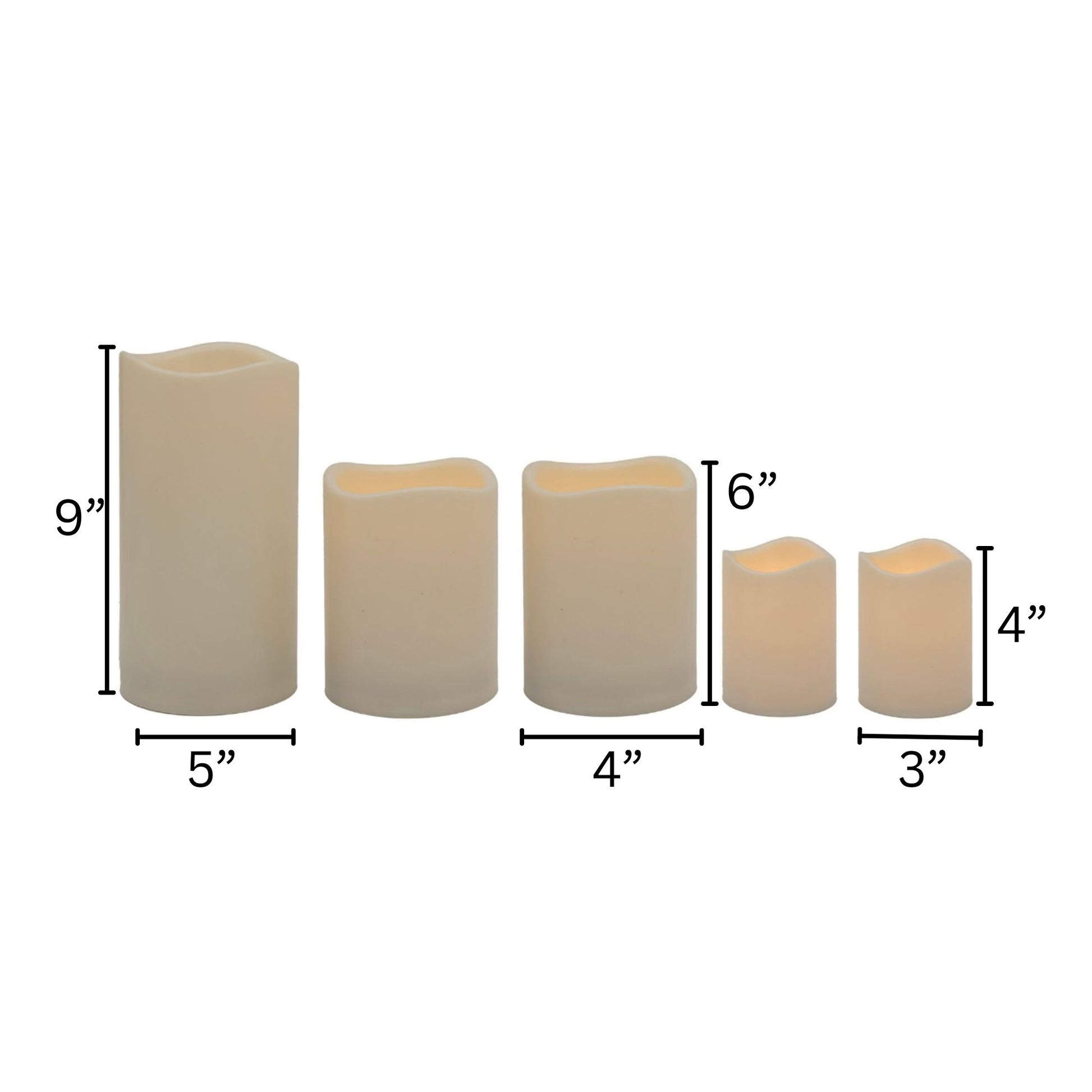 Enhance your home décor with this set of 5 battery operated flameless LED pillar candles. With the convenience of a 4 and 8 hour timer, this set of LED pillar candles will add beautiful accent lighting as their warm amber glow illuminates your home. Their cream exterior is constructed of plastic which will keep the surface clean and smooth, allowing no chance for dings or dents, making this set of pillar candles a practical accent for your everyday home décor. Two smaller candles require 3 AA batteries each (not included) and three larger candles require 3 D batteries each (not included).