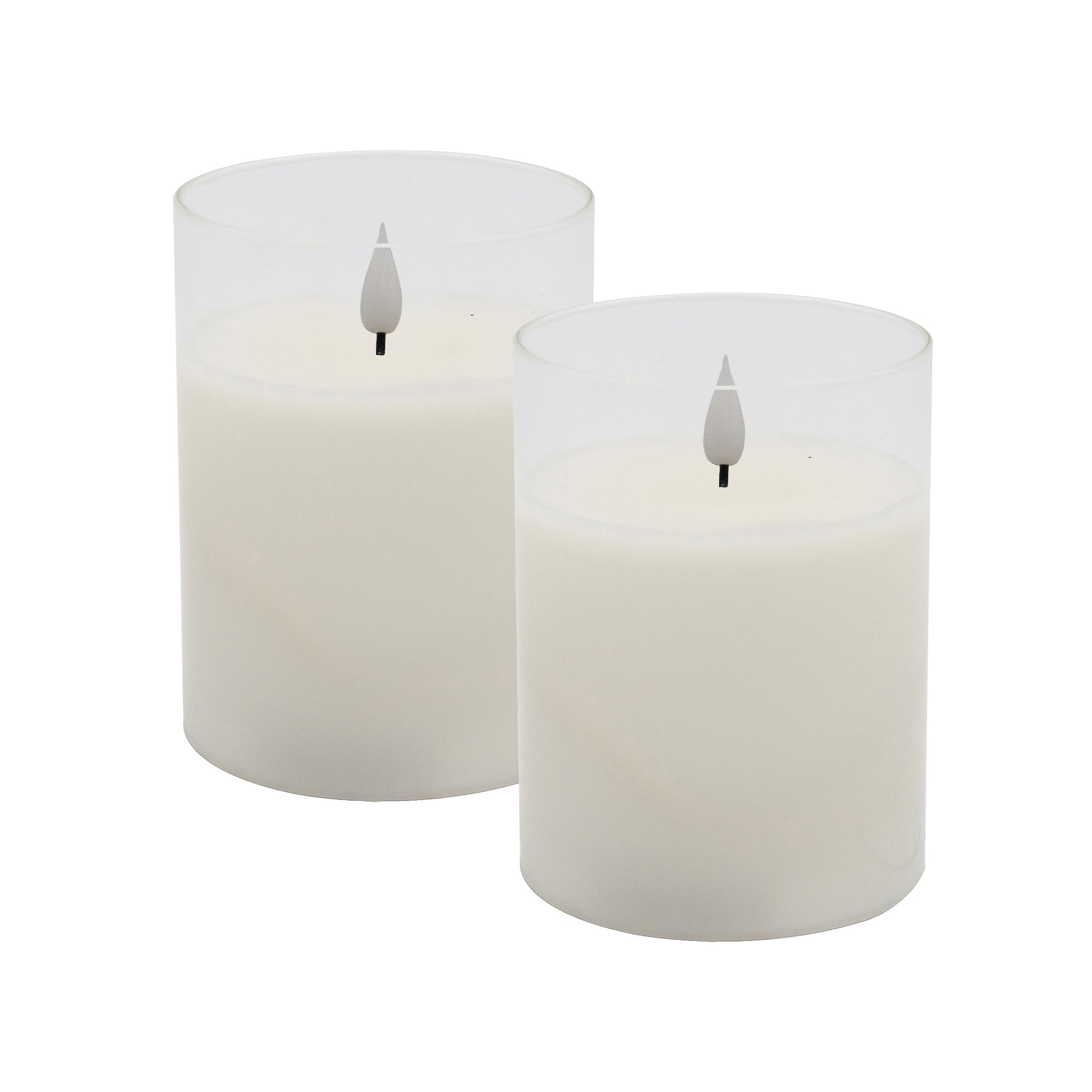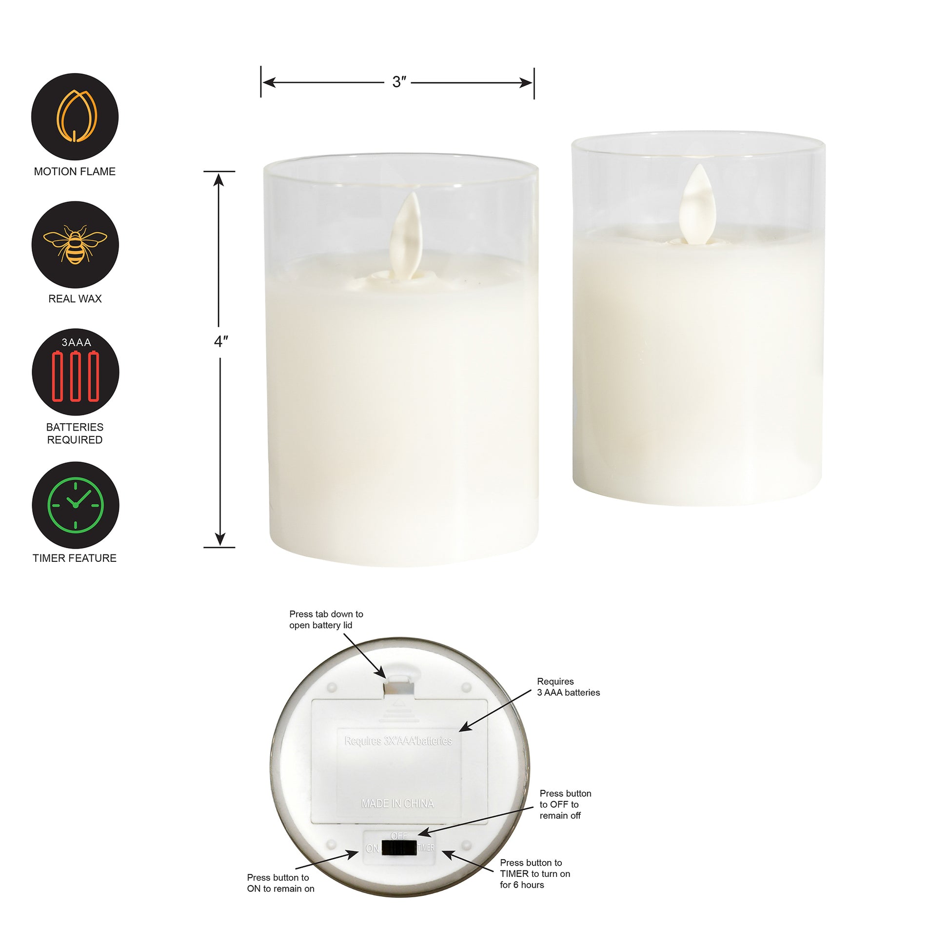 Accent your home with this traditional pair of battery-operated flickering flame candles. The clear glass includes genuine poured wax and a pivoted flame-shaped wick with flickering amber LED light. The natural flickering light creates the illusion of a real candle without the worry of drips, smoke, or flames. This set of two candles features a convenient timer option for 6 hours on and 18 hours off. Each candle requires 3 AAA batteries (not included).