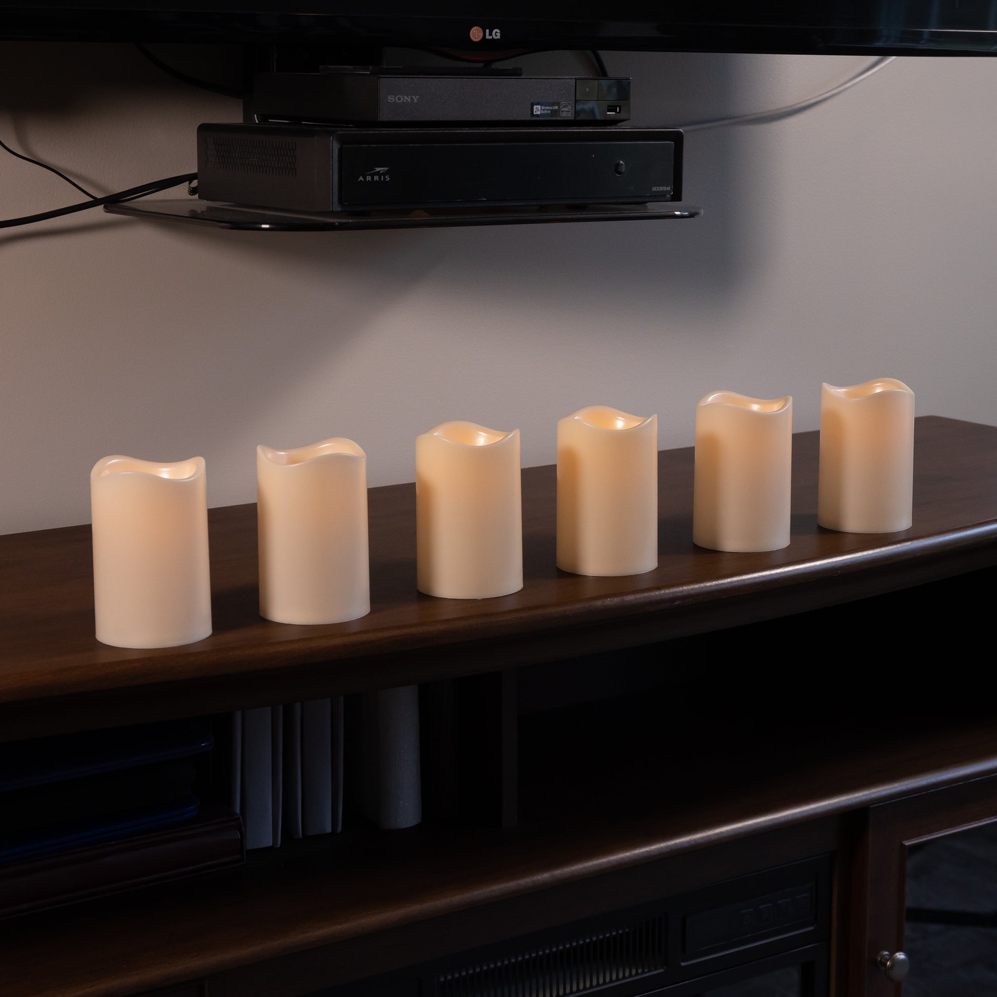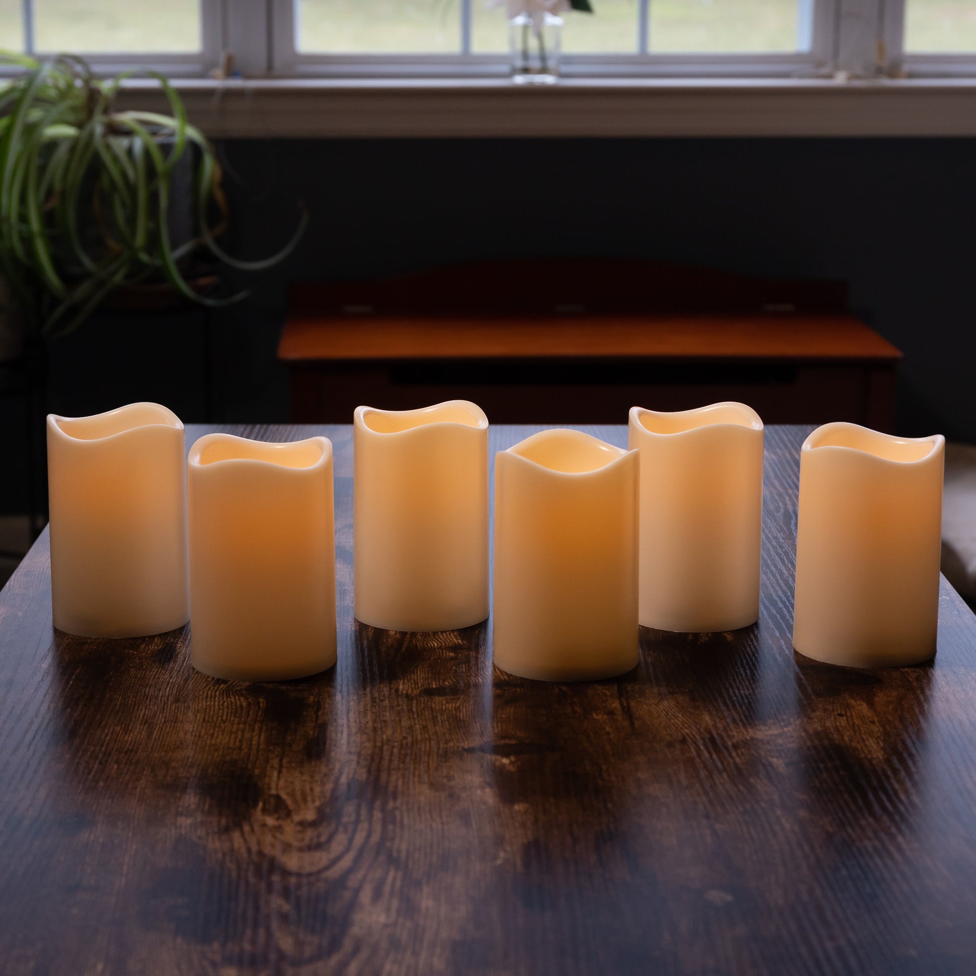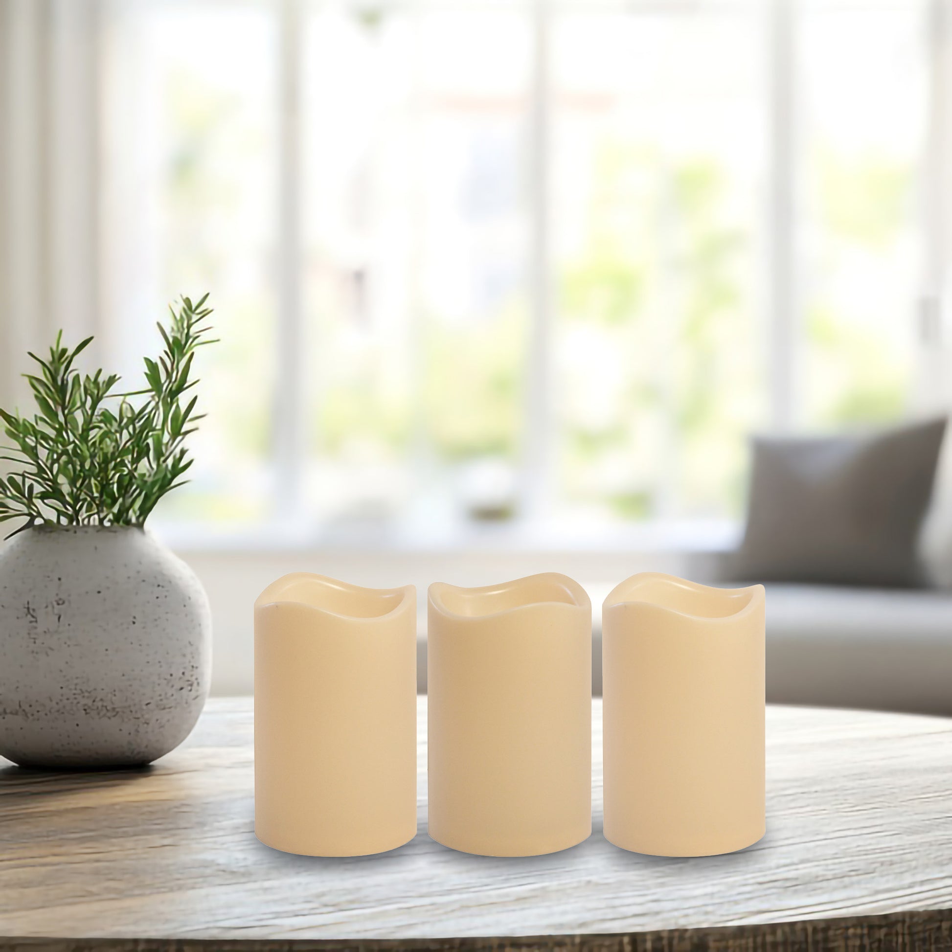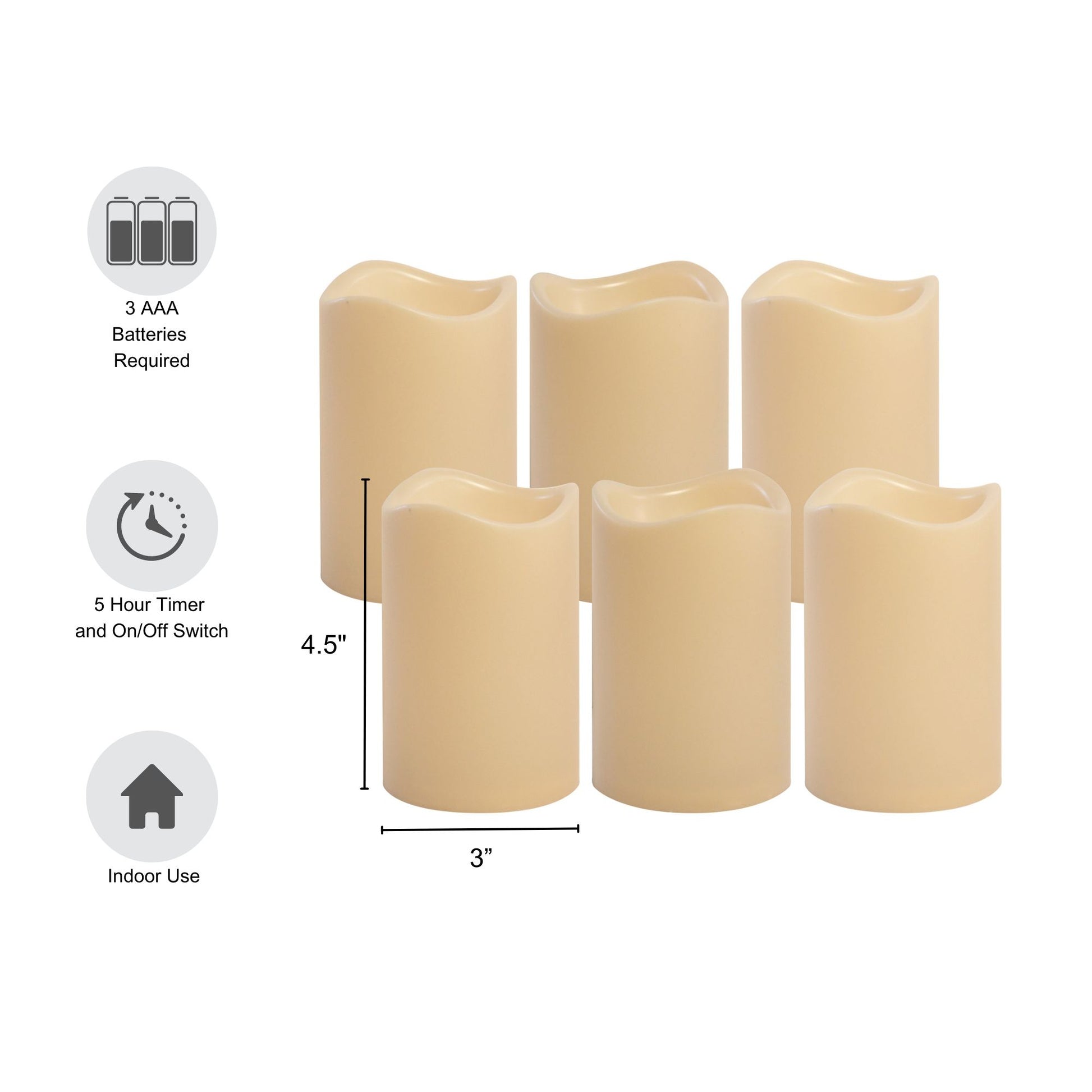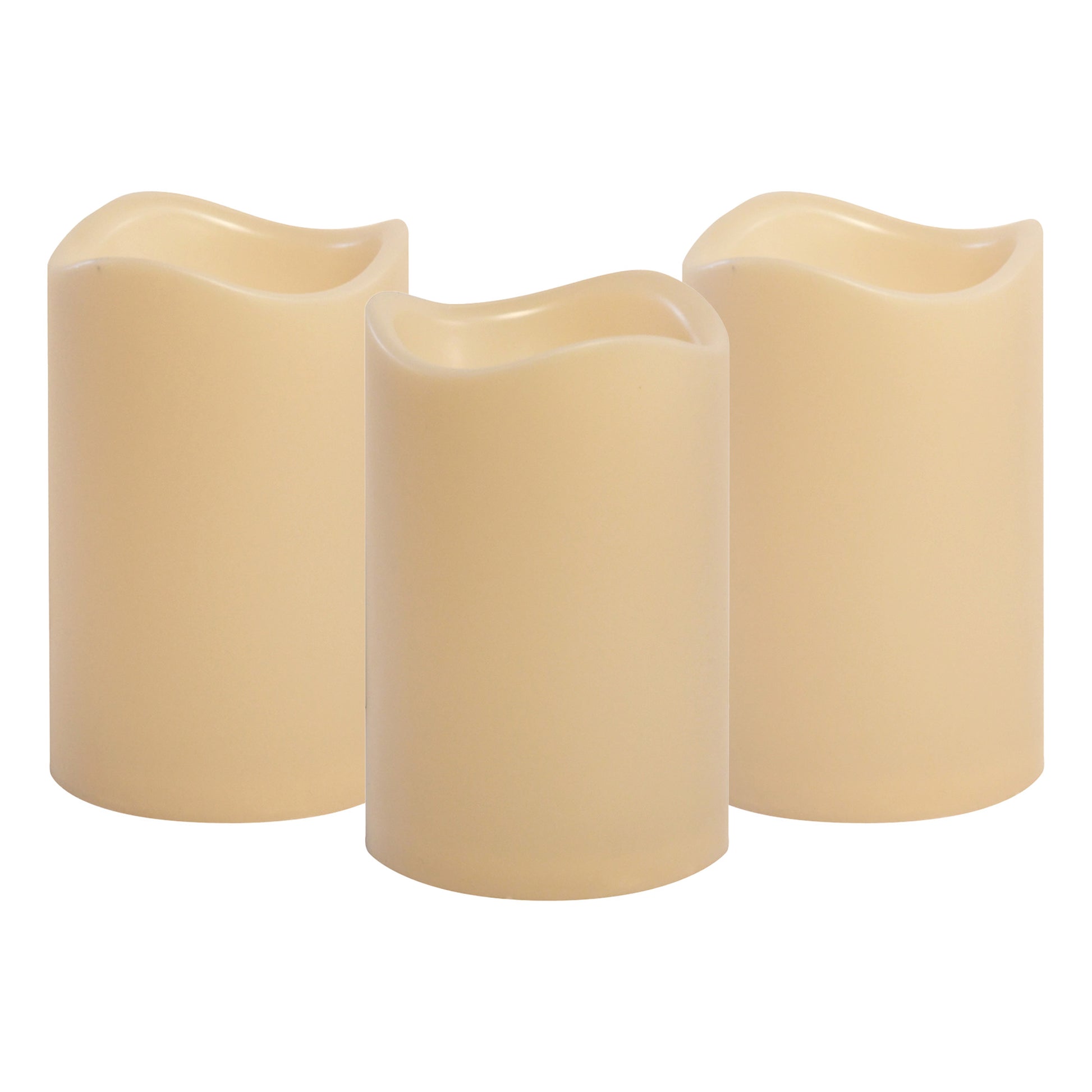 This set of LED pillar candles, paired with the warm glow of an amber light, adds a beautiful ambiance to your home. These elegant battery-operated cream candles are unscented and offer a convenient built-in 5-hour timer. Flameless candles provide a beautiful look and are completely worry-free. The plastic construction keeps the candle surface clean and smooth without the chance for dents like real wax. Each candle requires 3 AAA batteries (not included).