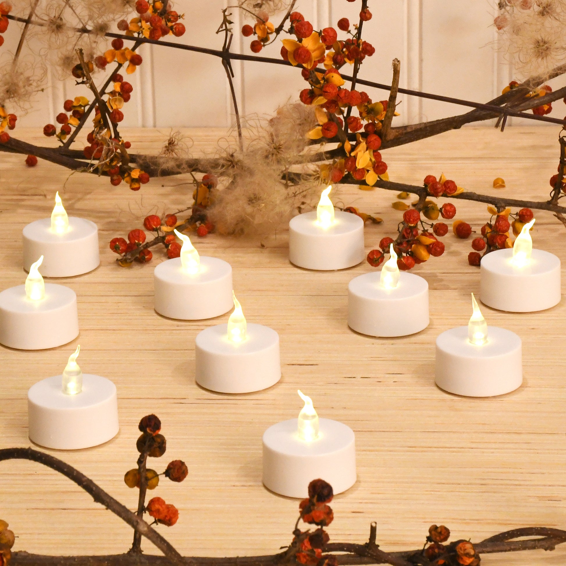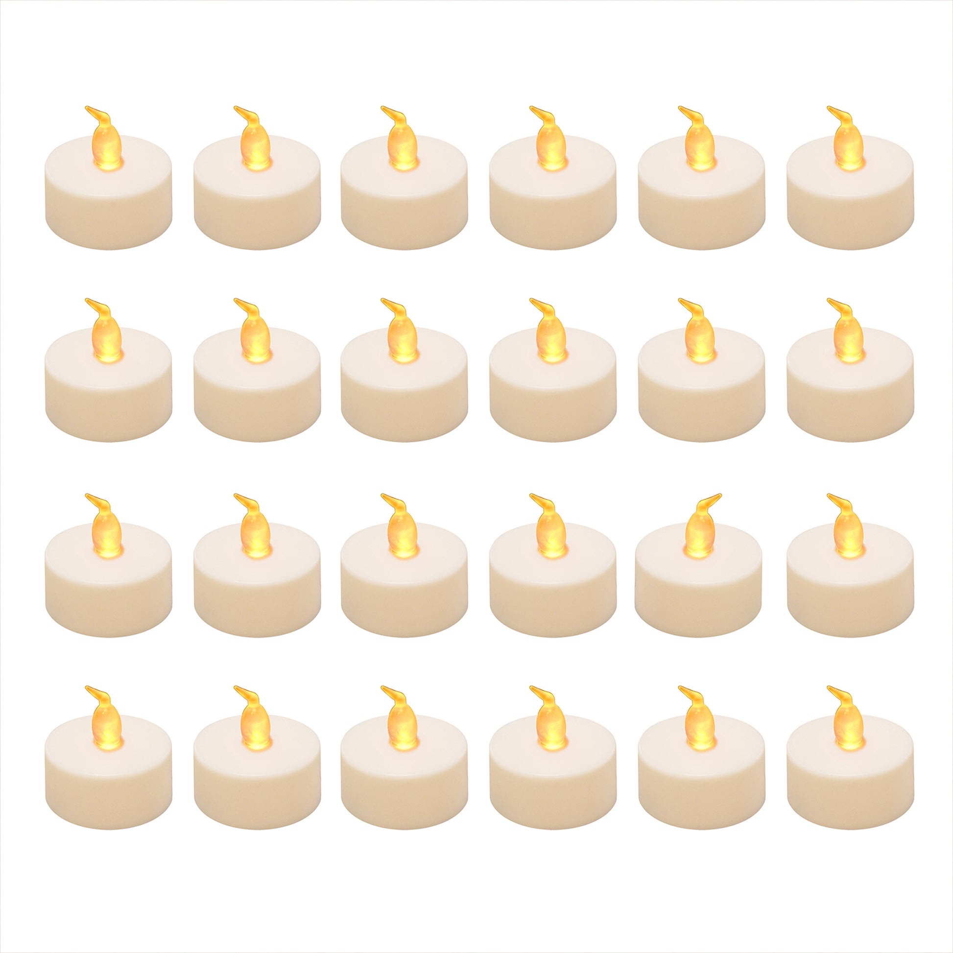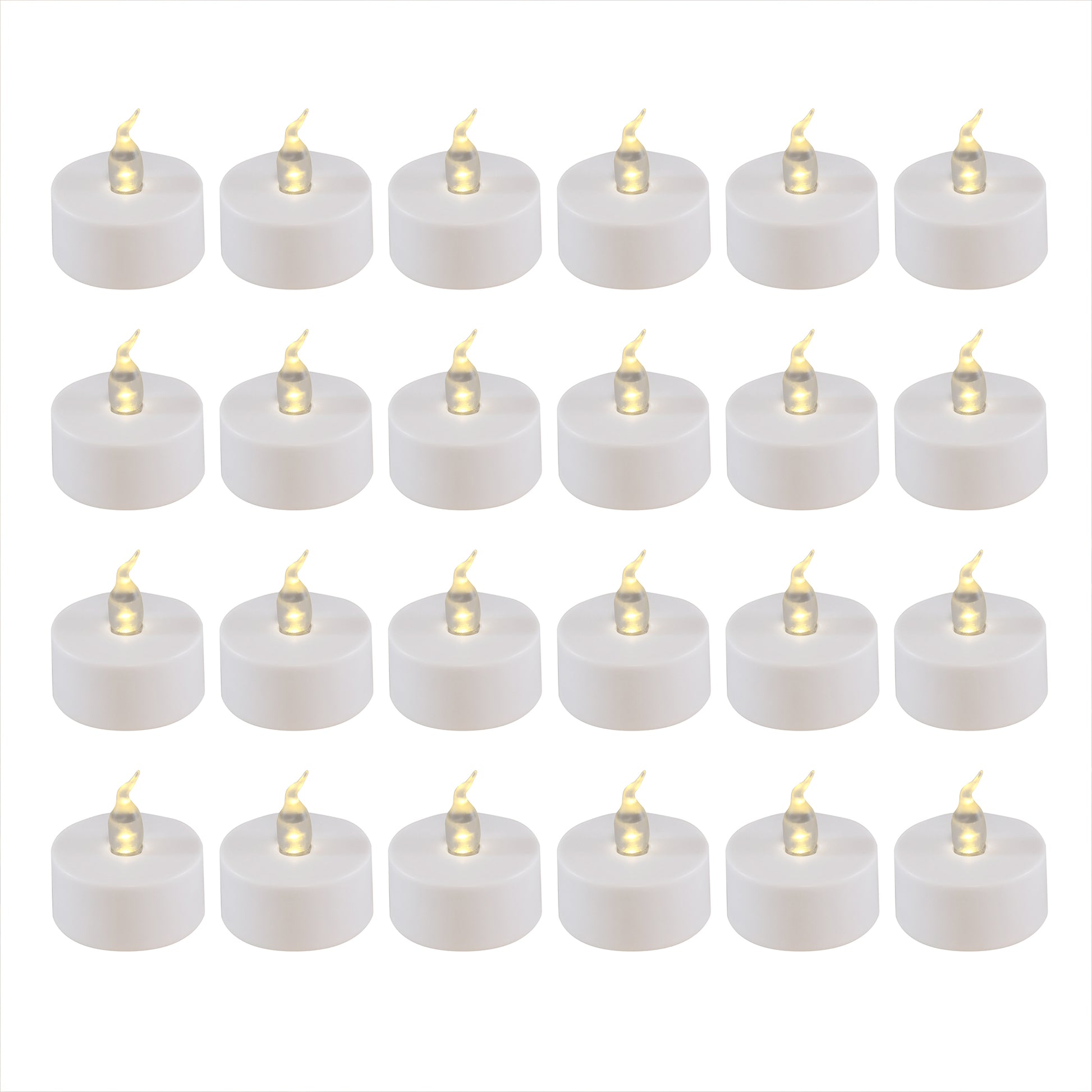Illuminate a party, event, or everyday home décor with the twinkling glow of battery-operated tea light candles. This set of 24 flameless candles are a safe and easy alternative to traditional candlelight. They turn on from the base with the push of a button and are supplied with CR2032 batteries. The lovely glow of LED tea lights add brilliant illumination on tables, mantles, and table settings for special occasions or everyday home décor.