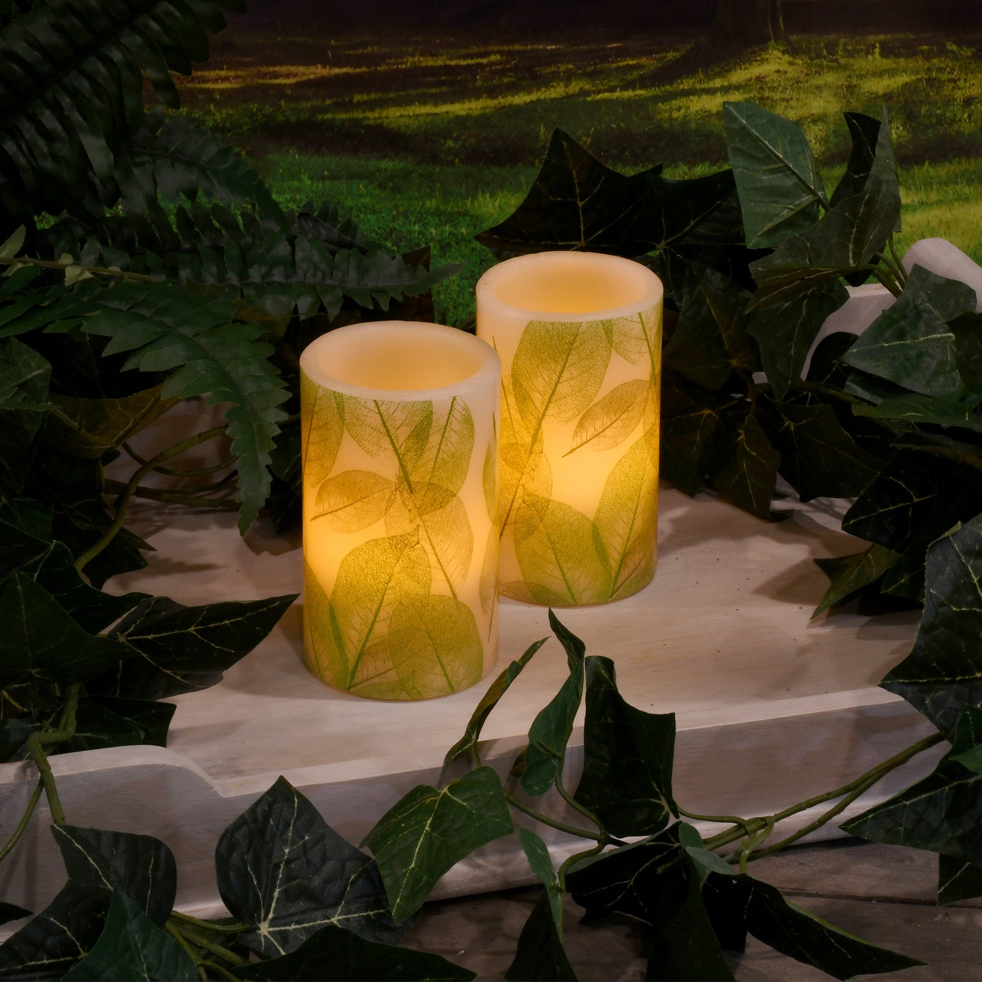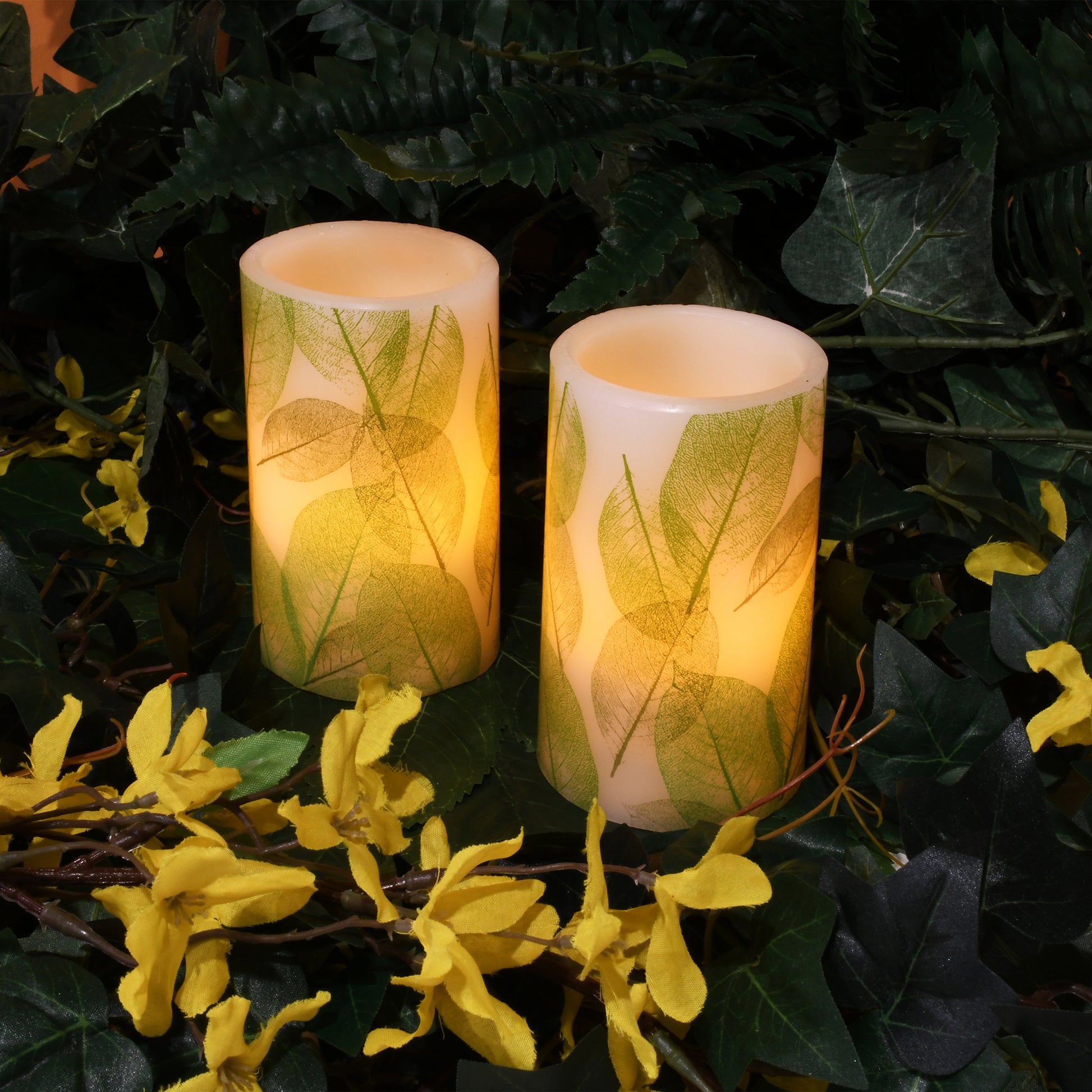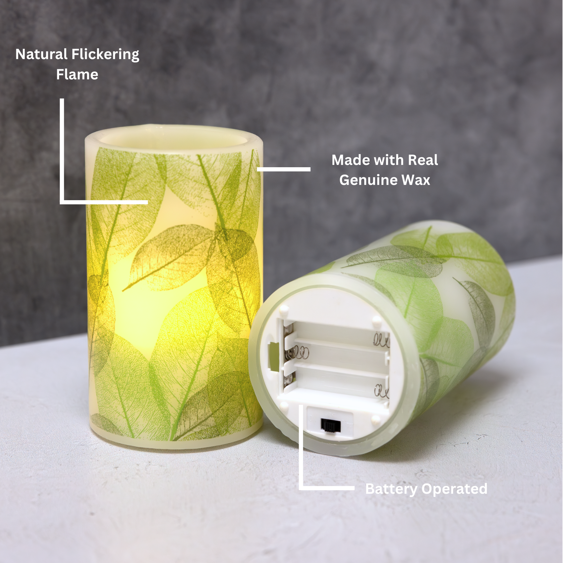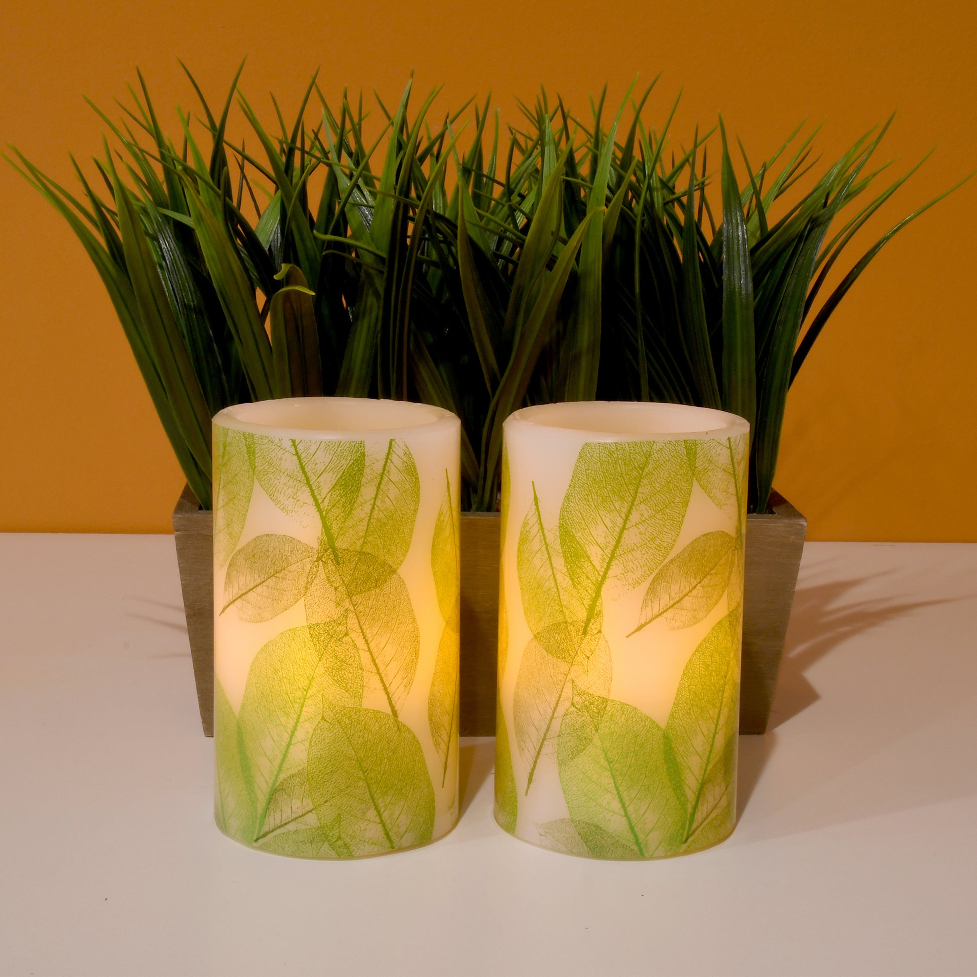 Elegant leaves add a garden feel to this set of lovely LED candles. Flameless candles provide an inviting glow that perfectly pairs with any modern, rustic, contemporary, or industrial décor. The amber glow adds that special touch of ambient lighting without any drips, smoke, or flames. Each candle requires 3 AAA batteries (not included).