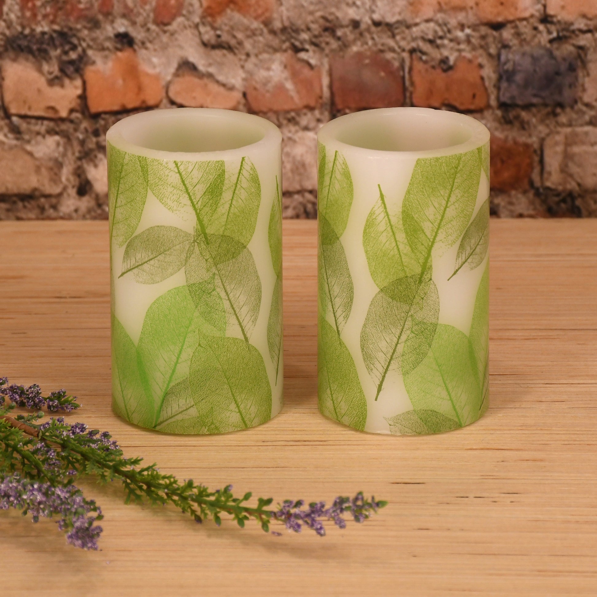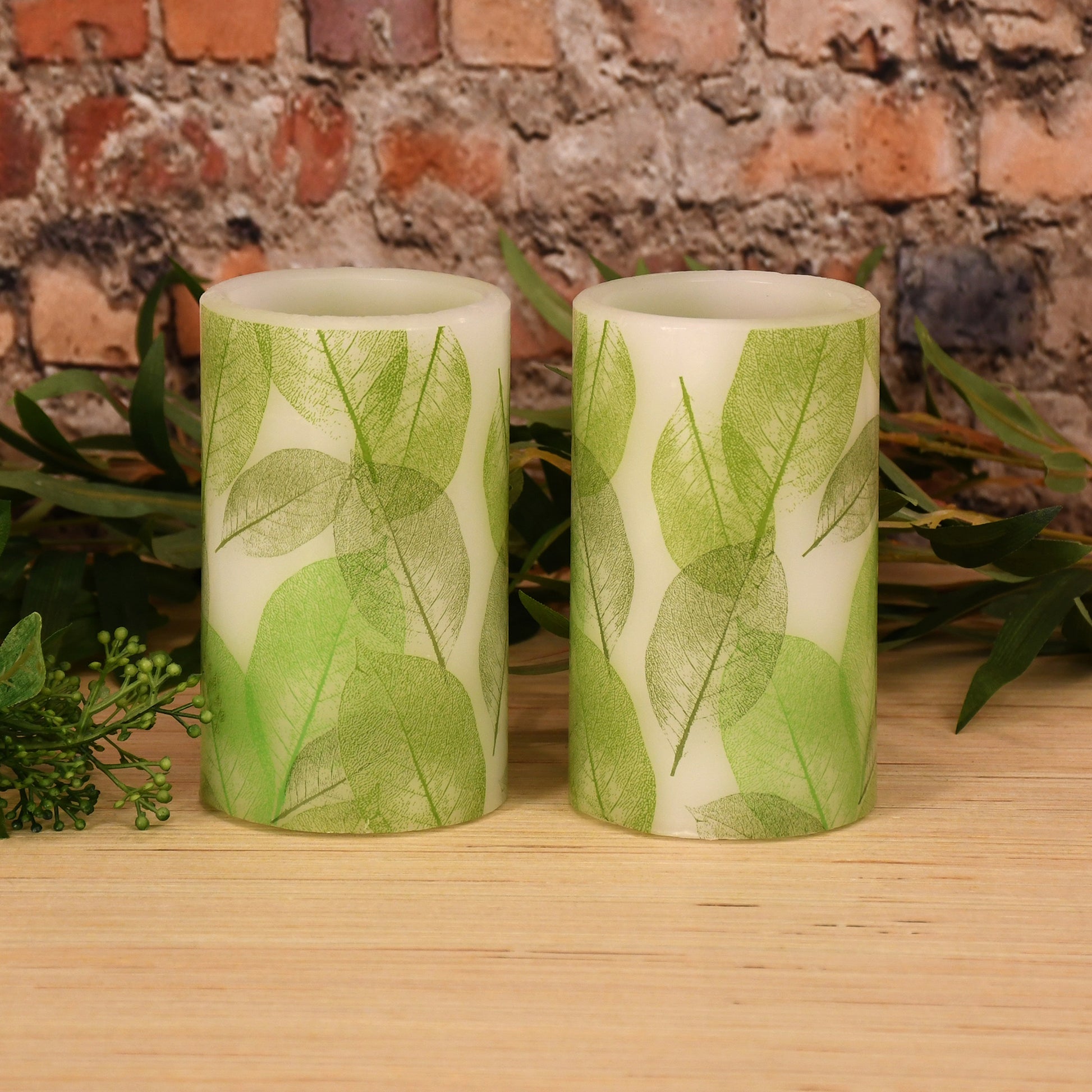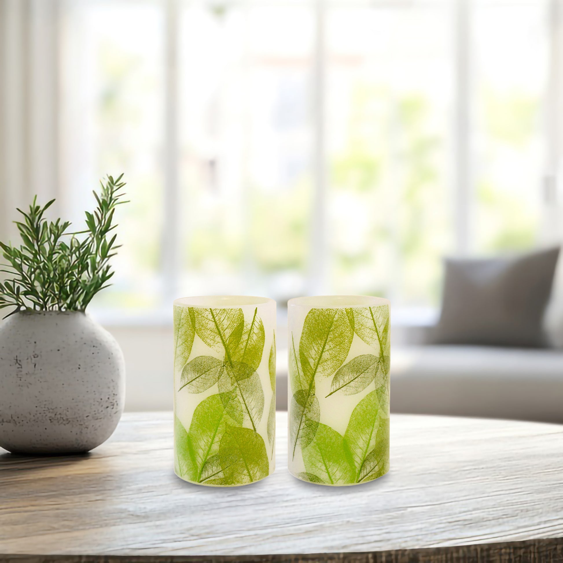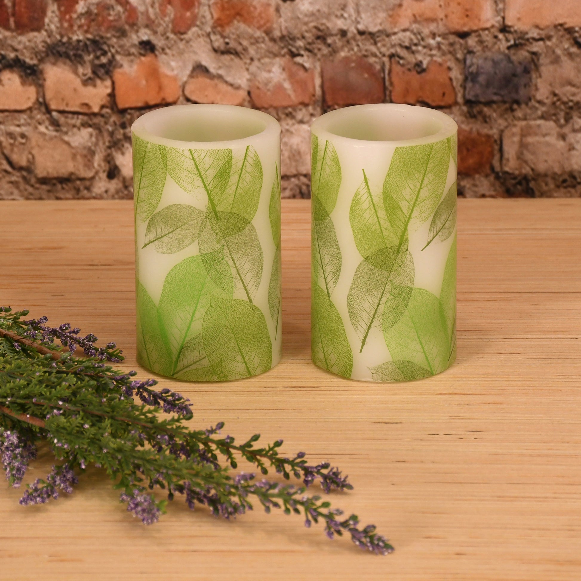 Elegant leaves add a garden feel to this set of lovely LED candles. Flameless candles provide an inviting glow that perfectly pairs with any modern, rustic, contemporary, or industrial décor. The amber glow adds that special touch of ambient lighting without any drips, smoke, or flames. Each candle requires 3 AAA batteries (not included).