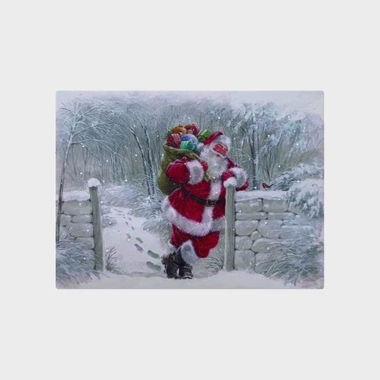 Decorate your home for Christmas with the lovely battery-operated "Snowy Santa" lighted wall art. The canvas features Santa in his bright red suit carrying a sack of presents in a snow-covered field. Steady cool white LED lights emphasize the falling snow and steady warm white LED lights accent Santa's suit. This beautifully printed canvas wall art is the perfect addition to your Christmastime home décor. The full-color canvas will look delightful whether it is hung on a wall or placed on a shelf or mantel. Included is a remote control, making it convenient to turn on and off.