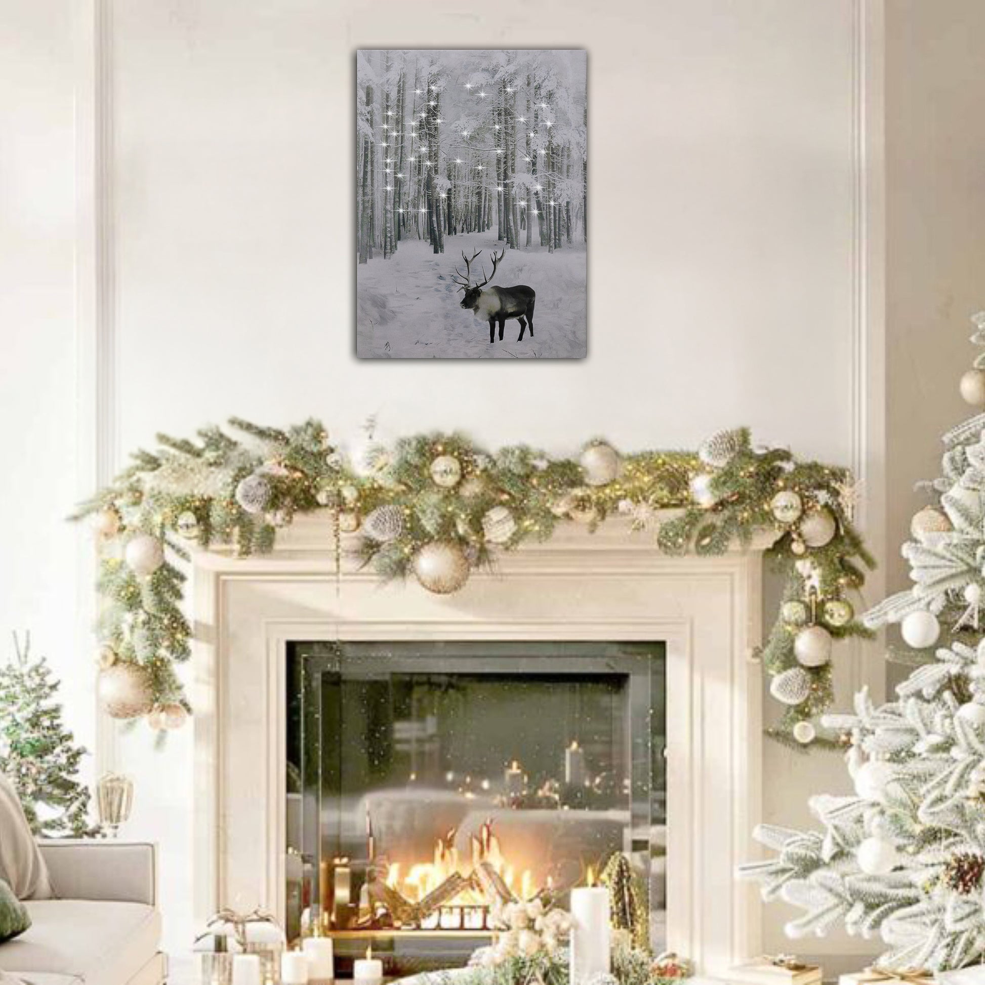 Decorate your home for winter with the lovely battery-operated "Still Winter Night" lighted wall art. The serene and gentle composition of an elk in a quiet, snowy forest creates a peaceful winter scene. This beautifully printed canvas wall art with twinkling cool white LED lights is the perfect addition to your wintertime home décor. The full-color canvas will look delightful whether it is hung on a wall or placed on a shelf or mantel. Included is a remote control, making it convenient to turn on and off.
