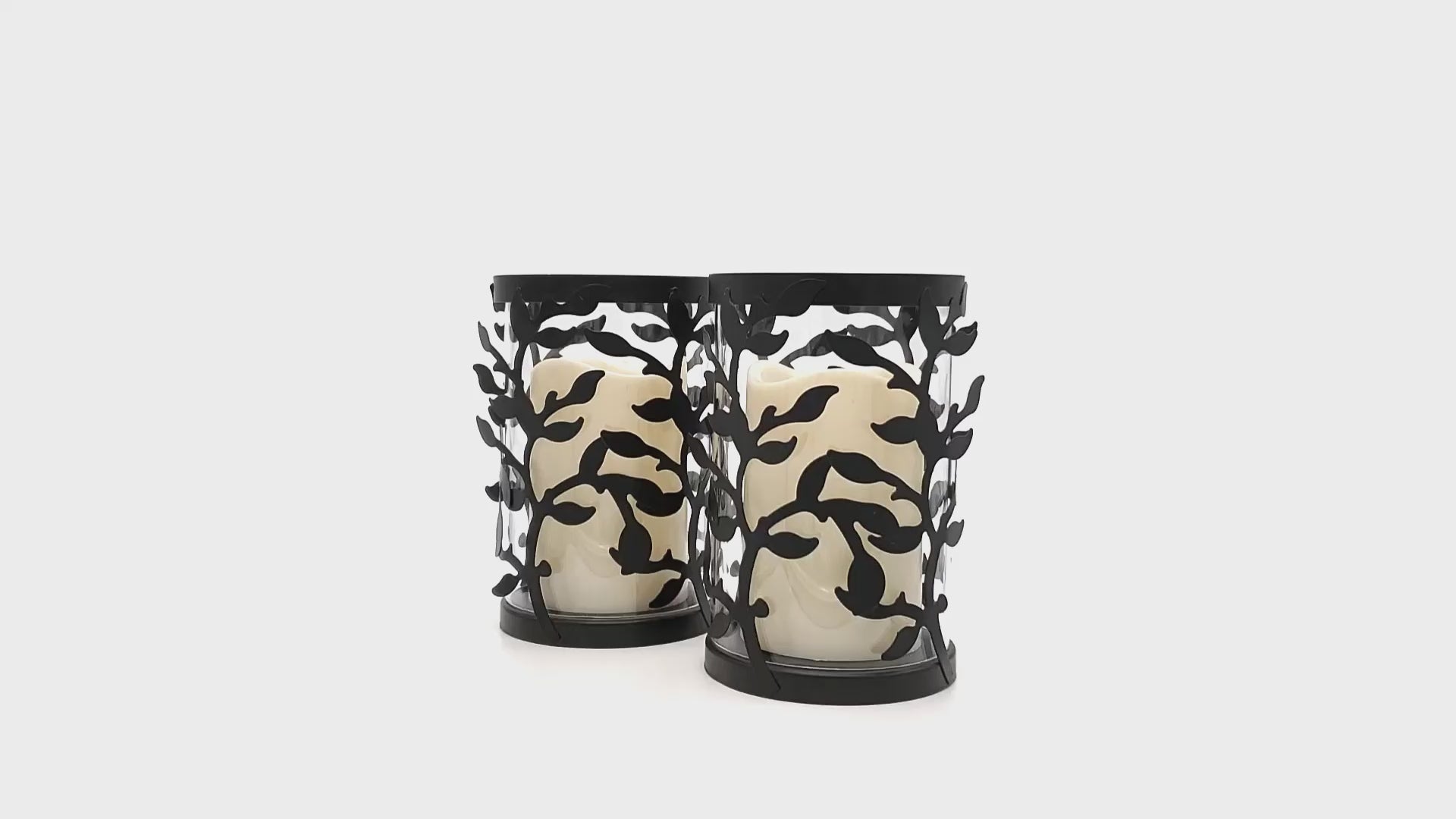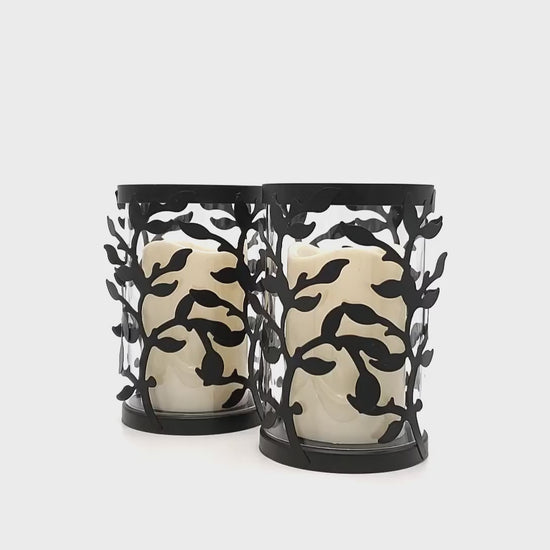 This set of two beautiful metal hurricanes with battery-operated candles will add a stunning glow to your indoor décor. The nonremovable LED candles provide a soft amber glow that illuminates through the crystal clear glass. The light has a convenient timer incorporated for 5 hours on and 19 hours off. Flameless LED hurricane candles are perfect for adding accent lighting to your special event, dinner party, or everyday home décor.