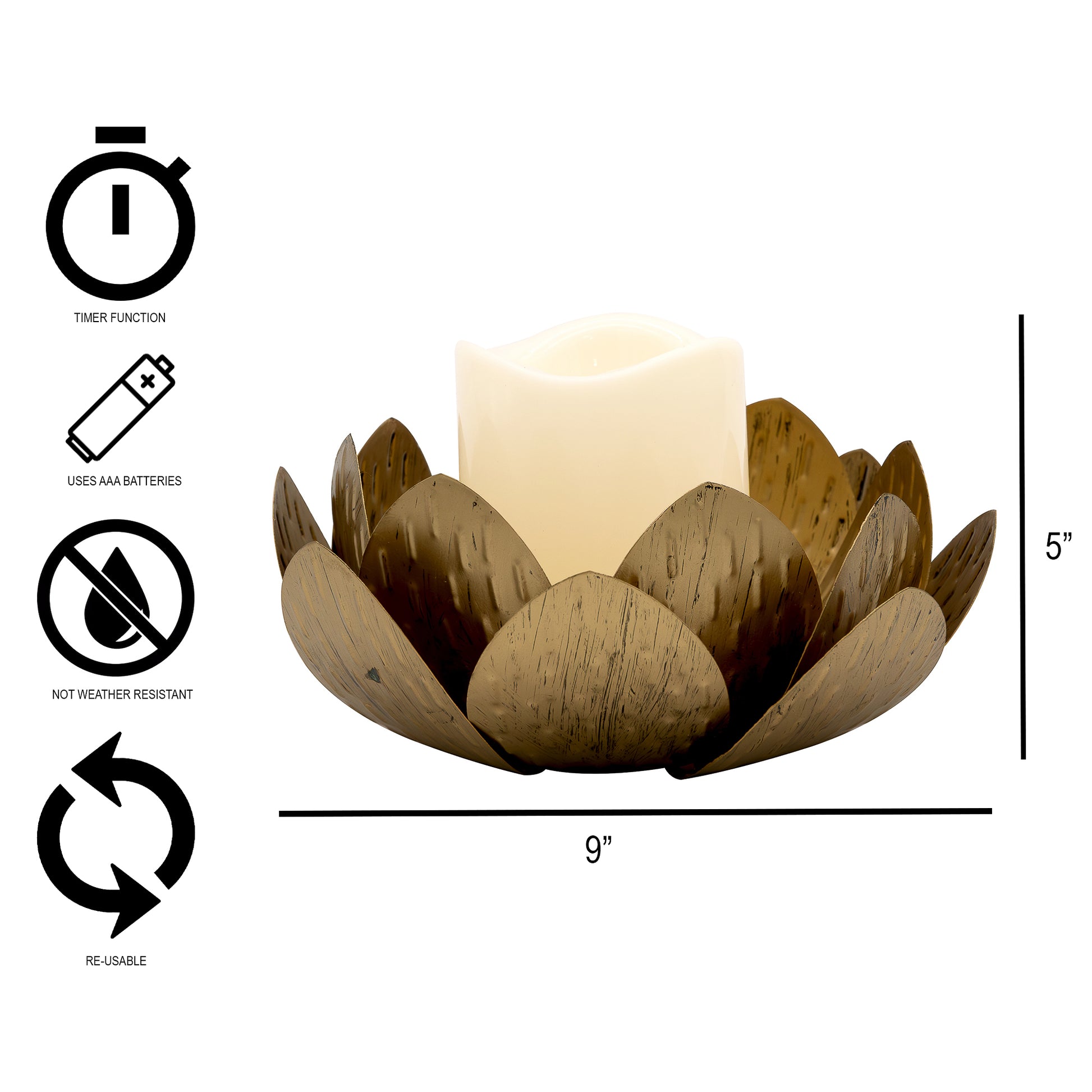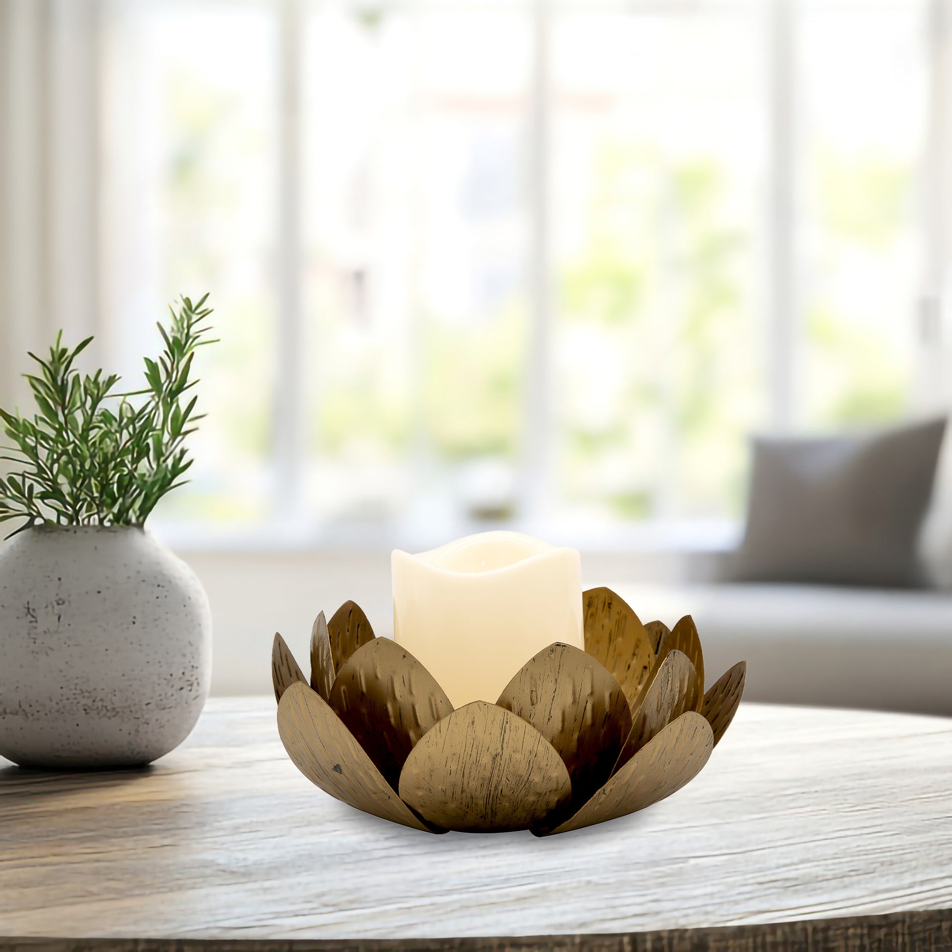 Gold Lotus Metal Candleholder with Battery-Operated LED Candle