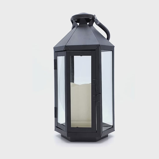 Create a warm and inviting atmosphere to your home décor with this beautiful metal lantern and battery-operated candle. The removable 4.5" LED candle provides a soft flickering amber glow that illuminates through the crystal-clear tempered glass panels. Flameless lanterns add lovely accent lighting to a special event, dinner party, or everyday home décor. The lantern includes a handle, making it perfect to hang on an indoor shepherd's hook or a bracket for a wall or ceiling. The candle has a convenient timer incorporated for 5 hours on and 19 hours off.