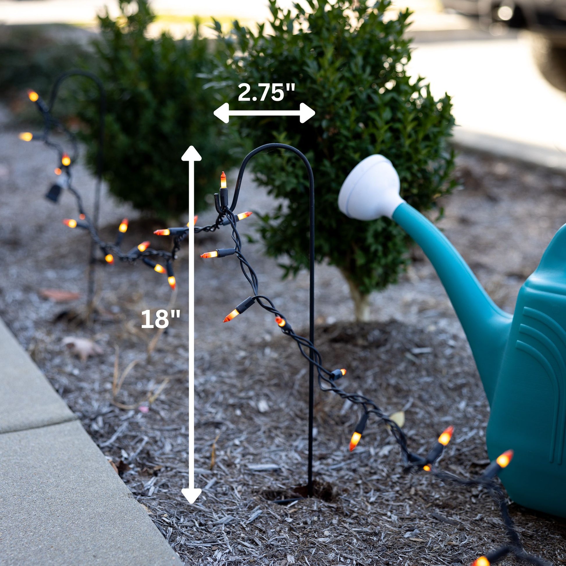 Shepherd's hooks add style and dimension to your outdoor décor by hanging lanterns, plants, wind chimes, bird feeders, or floral arrangements. This set of four decorative hangers feature a solid steel construction that is powder-coated for a finish that will stand up to the outdoor elements. The poles have dual forks that stake into the ground for easy installation and will add height and variety to a garden, walkway, entryway, or driveway.