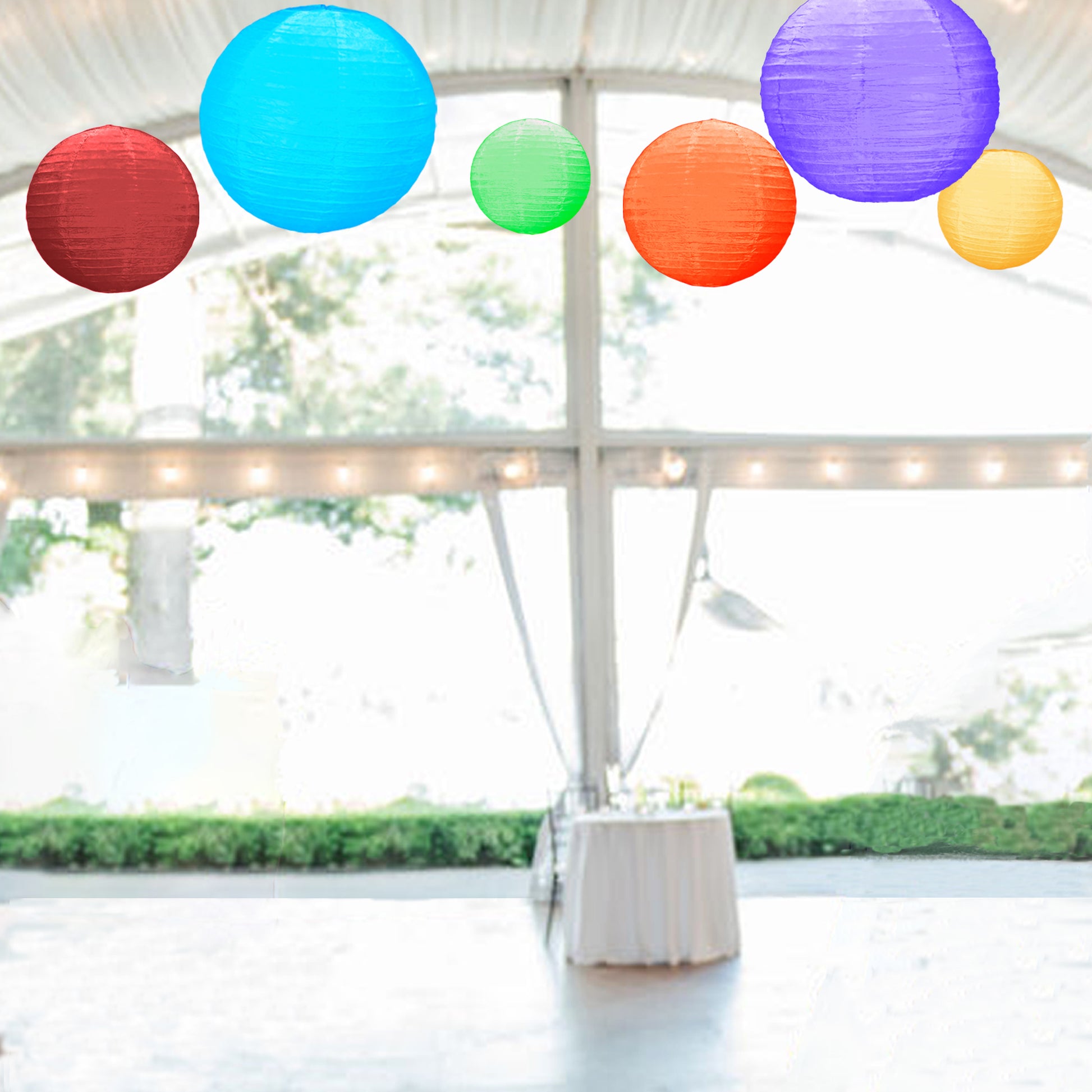 Bring a festive tone to your celebration or event with multi-size paper lanterns. This set of six includes three different sizes: 12", 14", and 16" (two of each size). Paper lanterns are an economical way to add color and dimension to your event. Their vibrant color creates a beautiful ambiance on tree branches, under a party tent, above a dinner table, or under a patio umbrella. They add flair and a festive feel any way you use them.