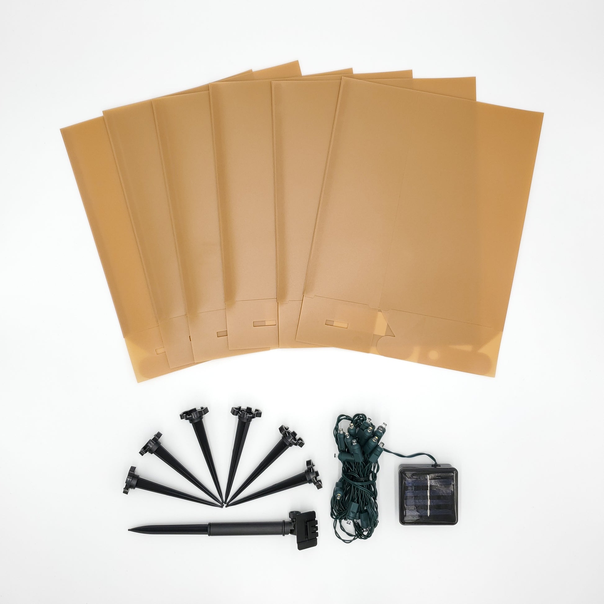 - Includes: 6 Plastic Luminaria Lanterns, 6 Anchor Stakes, and 1 Solar-Powered Cord with 18 LED Lights