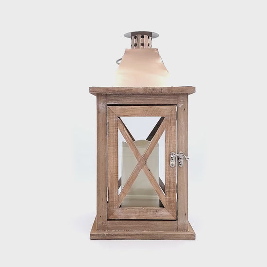 Wooden Lantern with Battery-Operated Candle - Natural with Copper Roof