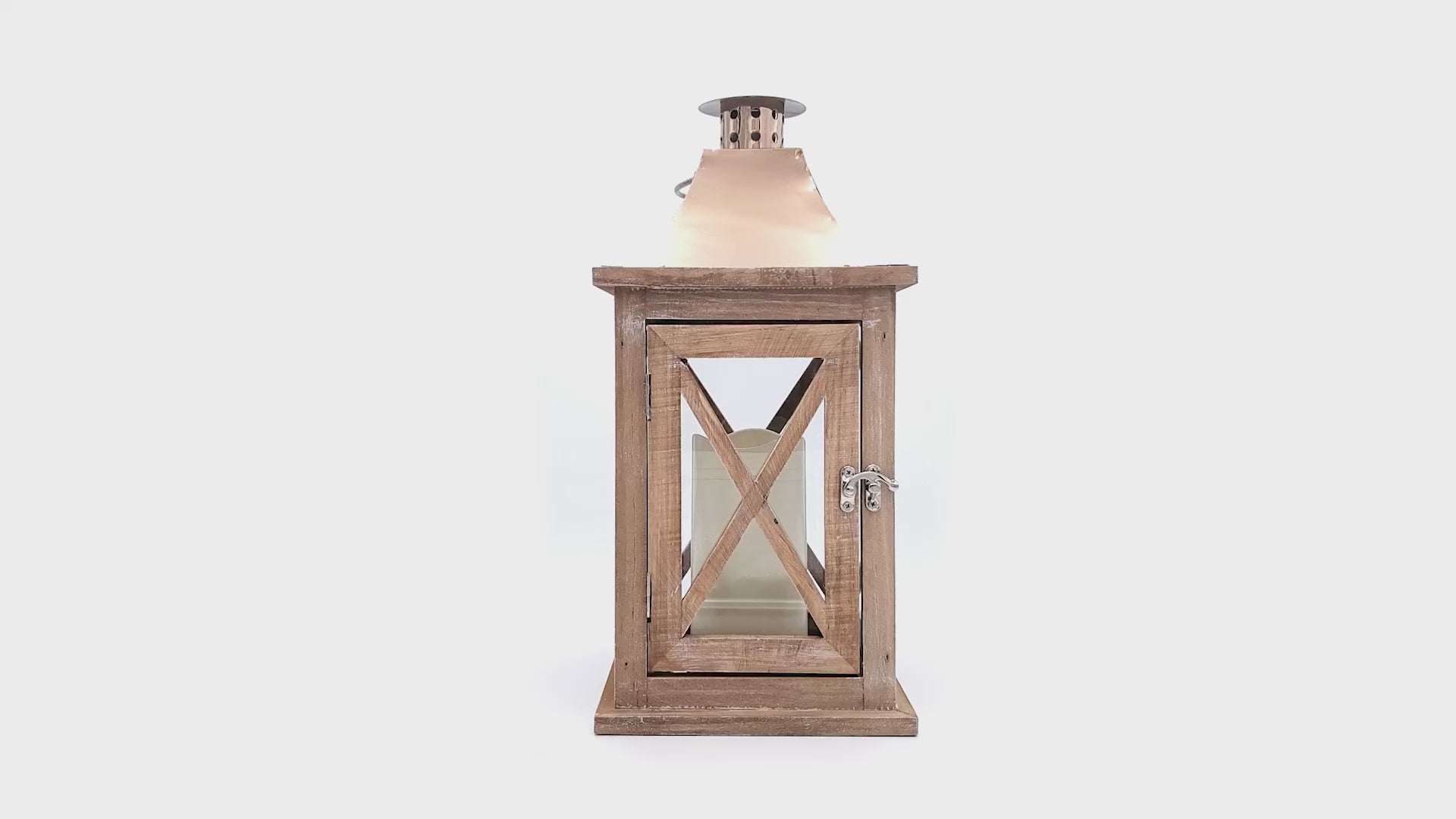 This beautiful natural wood lantern with a copper roof and removable LED candle will create a stunning look to your décor. It will easily brighten up any occasion, event, or everyday home décor. The 6" battery-operated candle inside this lantern provides lovely ambient lighting. The light source has a convenient timer incorporated with 5 hours on/19 hours off. Candle requires 3 AAA batteries (not included).